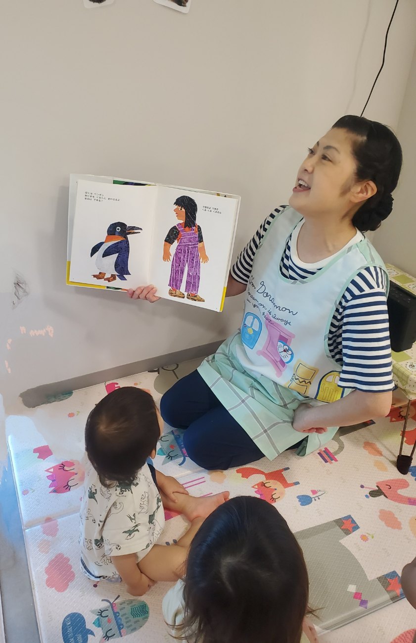 たいち(1歳児)ペンギンのまねをして、楽しく読み語りをしている 先生!