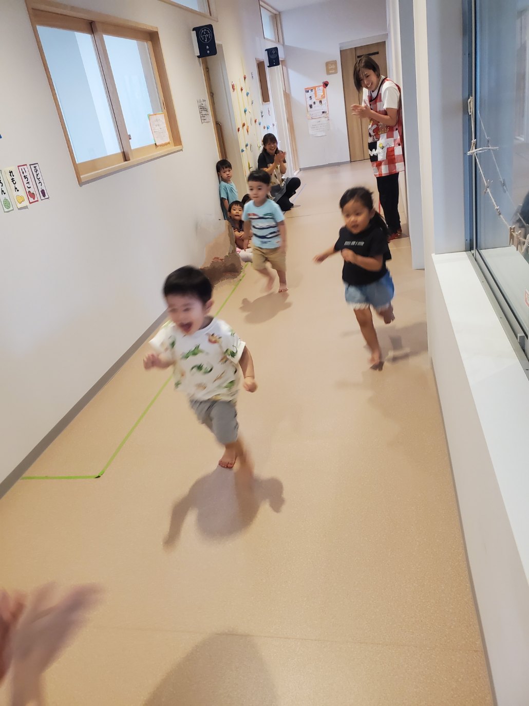 長~い廊下に出て、実際に走ってみます。