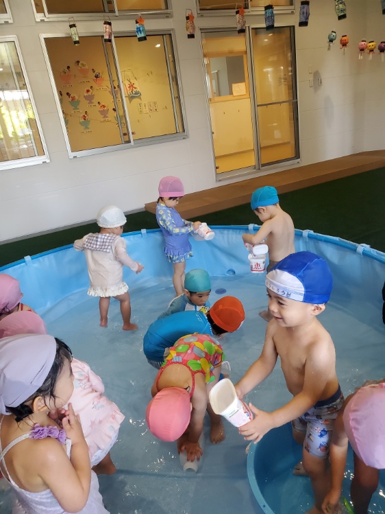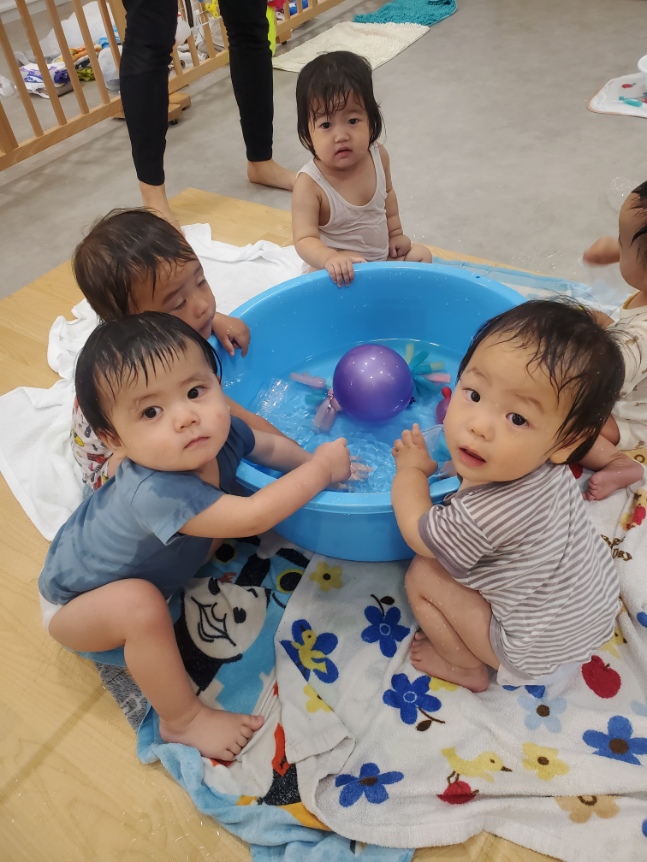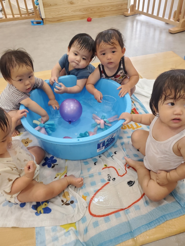 うみ組(0歳児)お部屋で水遊びだよ~