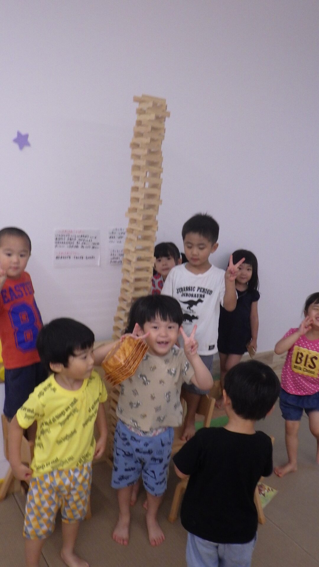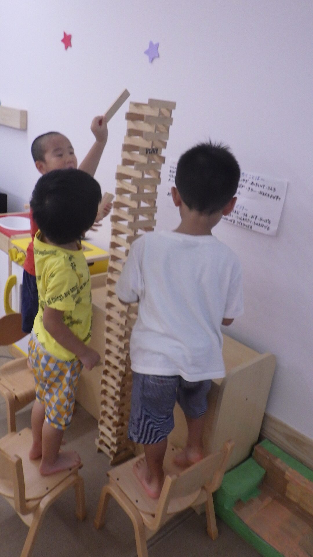 カプラを積みあげると、どんどん高くなるにつれてどうしようか考える子ども達…