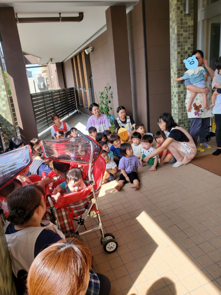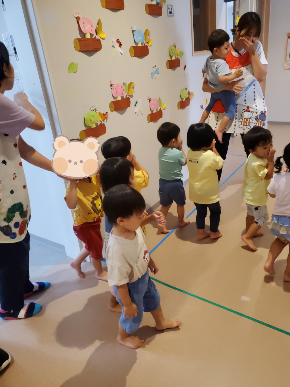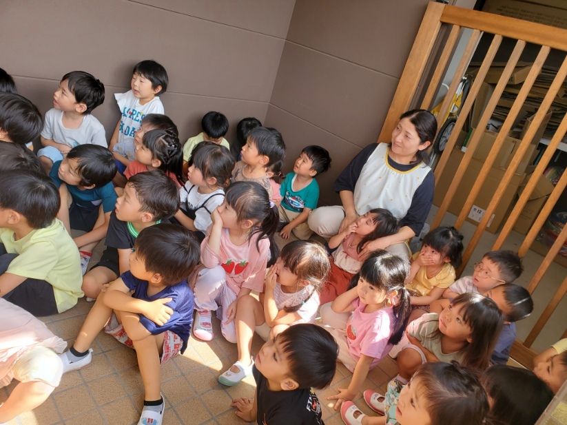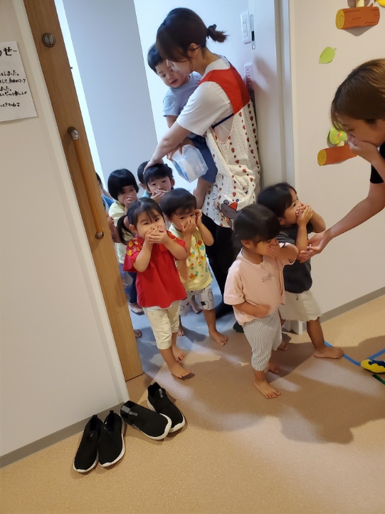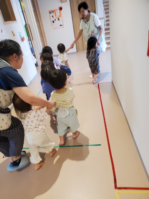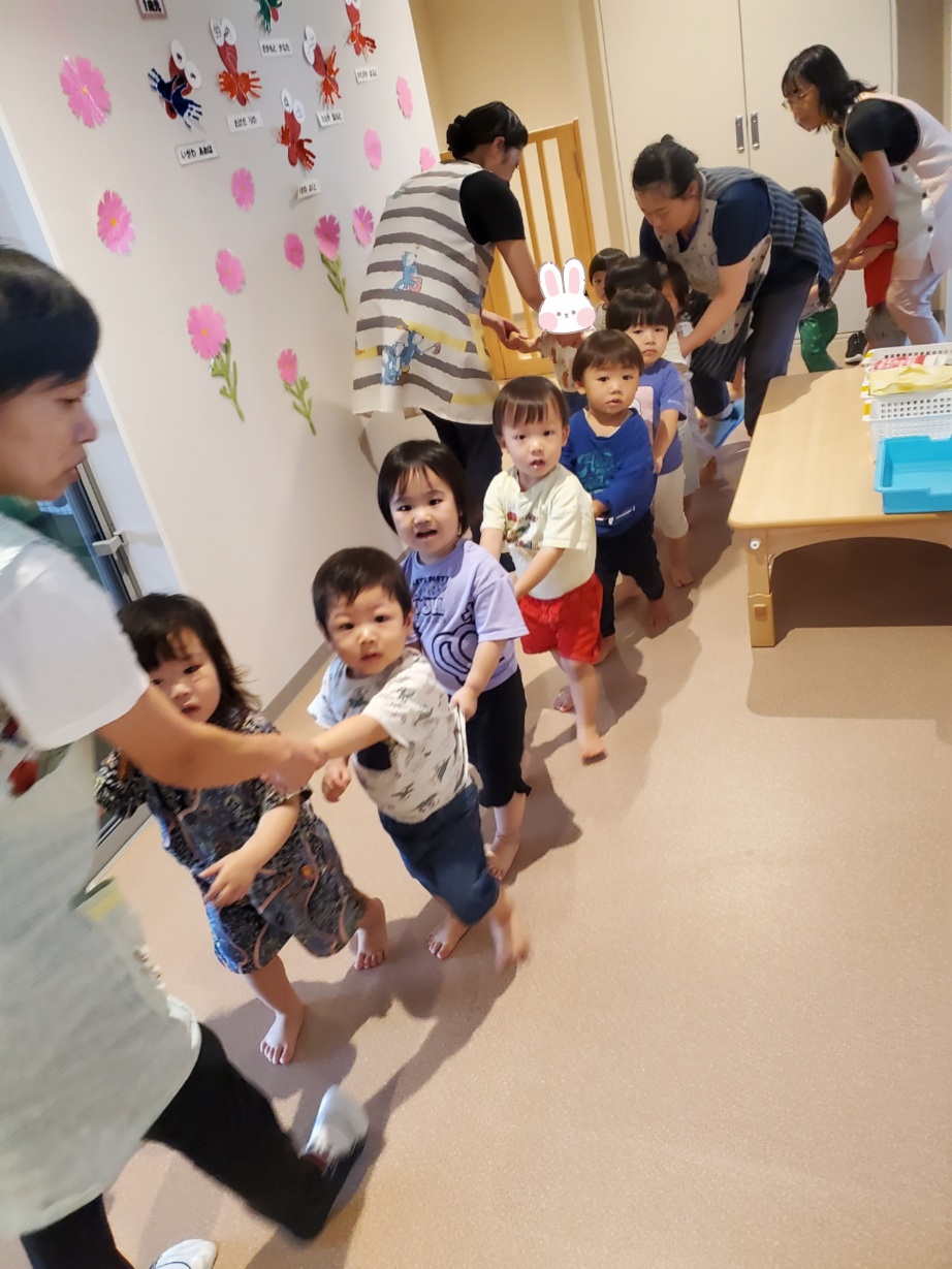にじ・そら・くじら組は落ち着いて2階から降りてきました。きちんと並んでおしゃべりもしていません。