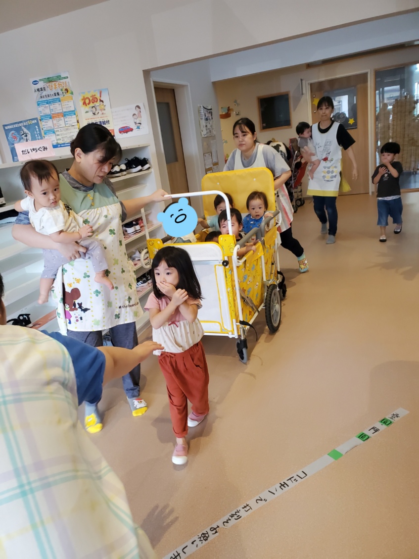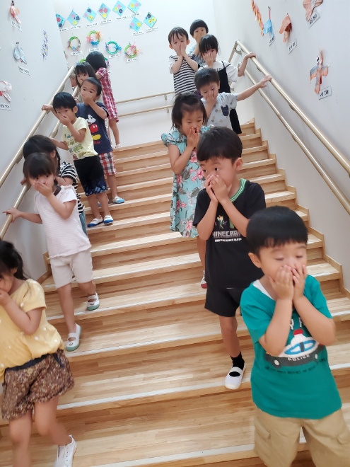 「1歳だいち組のきれいに並んで歩いて避難に感動しました。」 「2歳あめ組のお口に手を当てて避難も感動しました。」「2階から慌てることなく、おしゃべりもせずに、降りてきた、3,4,5歳児(にじ・そら・くじら組)に感動」・・