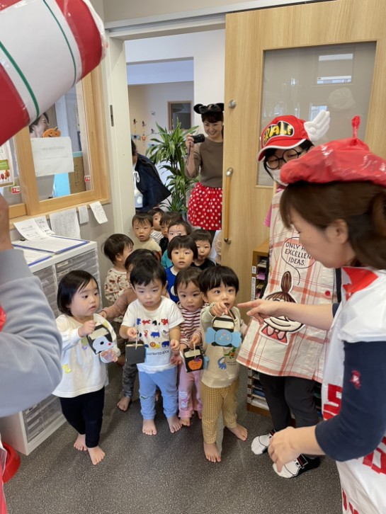 1歳(だいち組)が、あられちぇん!トミーマウス!などなど???に変装した先生と、ともにお菓子バックを持って、やってきました。