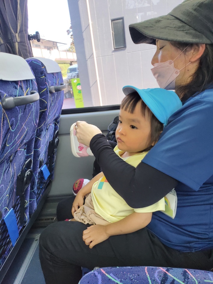 保育園の前の道は大型バスが入ってこれません。大通りまで歩いて大型バス(つくしの観光バス)に乗車します。