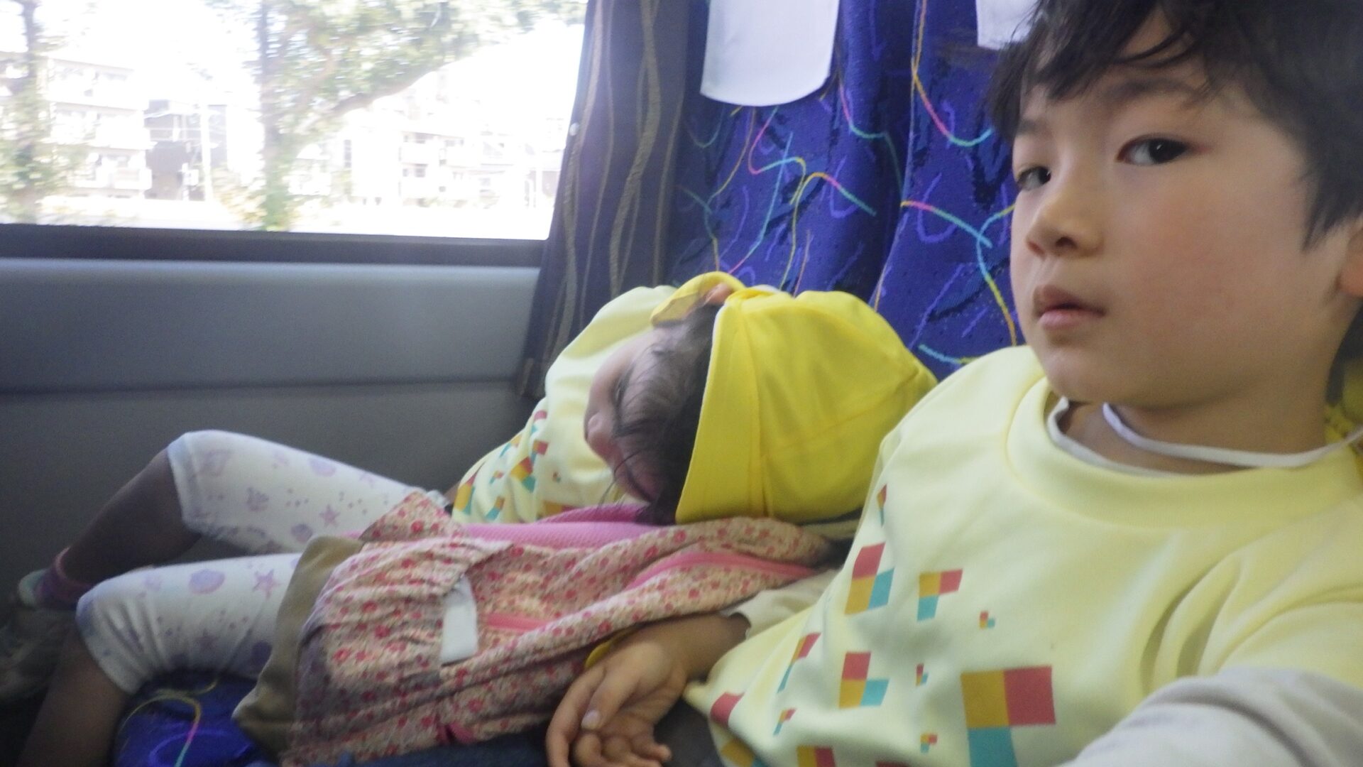 帰りのバスの中、そら・くじら組はチャレンジコースを歩いたので、帰りのバスの中では、この通り!