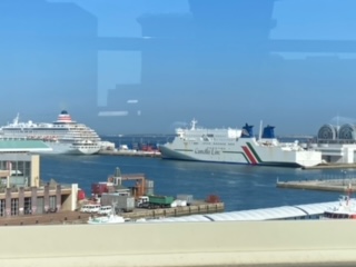 福岡市都市高速、築港付近、大きな客船が2隻停泊しています。「かっこいい~!」子ども達は大騒ぎ。