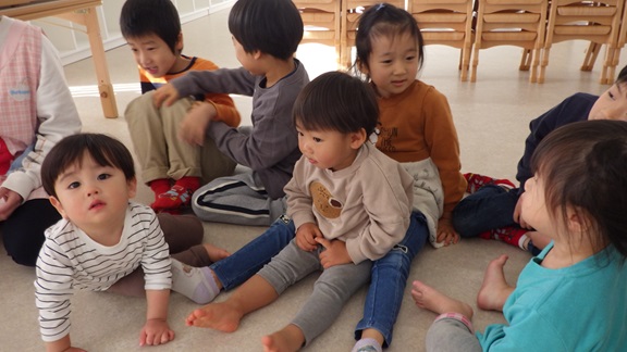 今日は、くじら組のお部屋にだいち組(1歳児)さんが遊びに来てくれました。