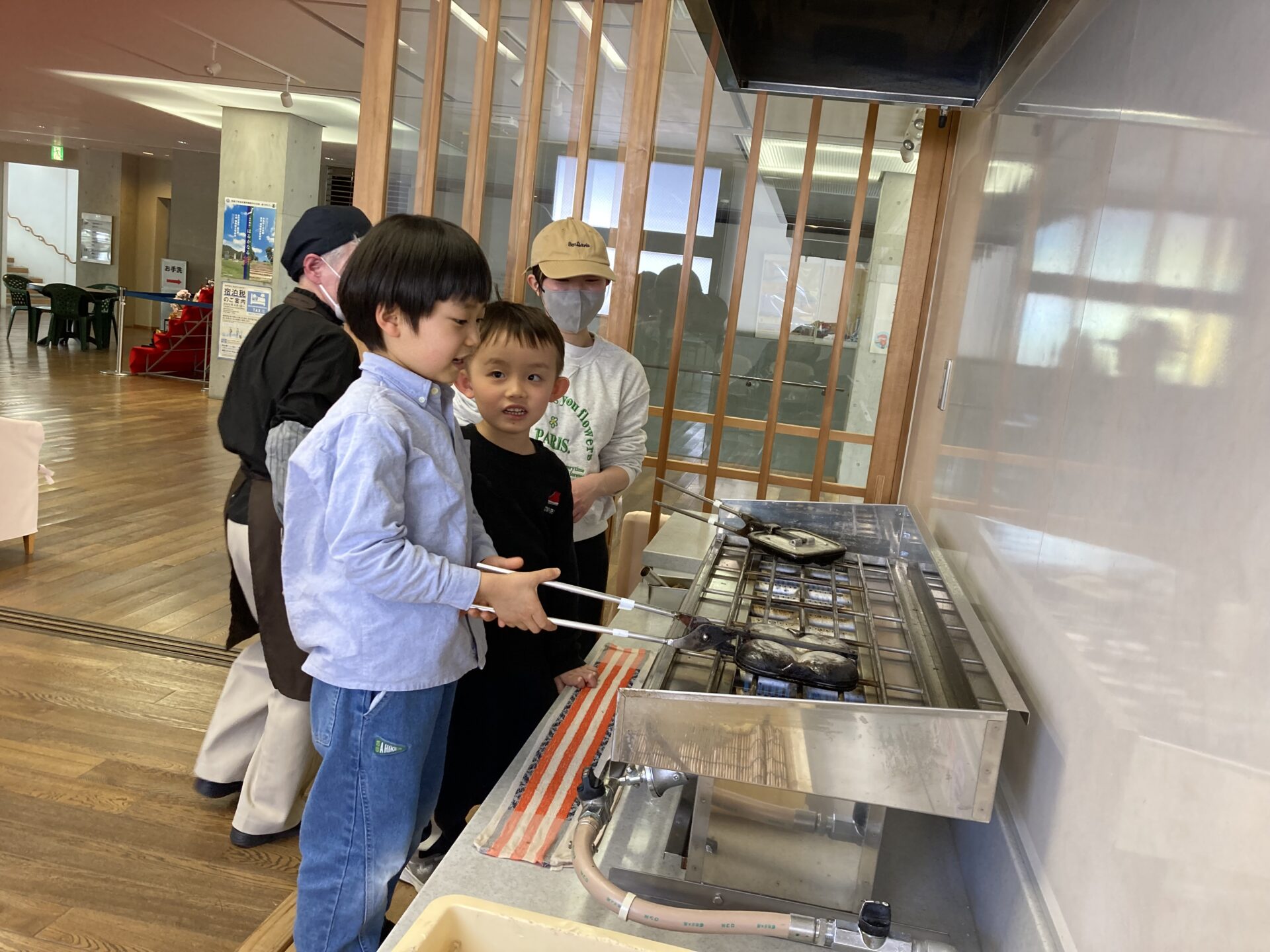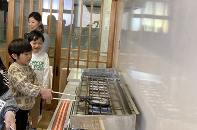 梅の刻印が入った鉄板で手焼きに挑戦。