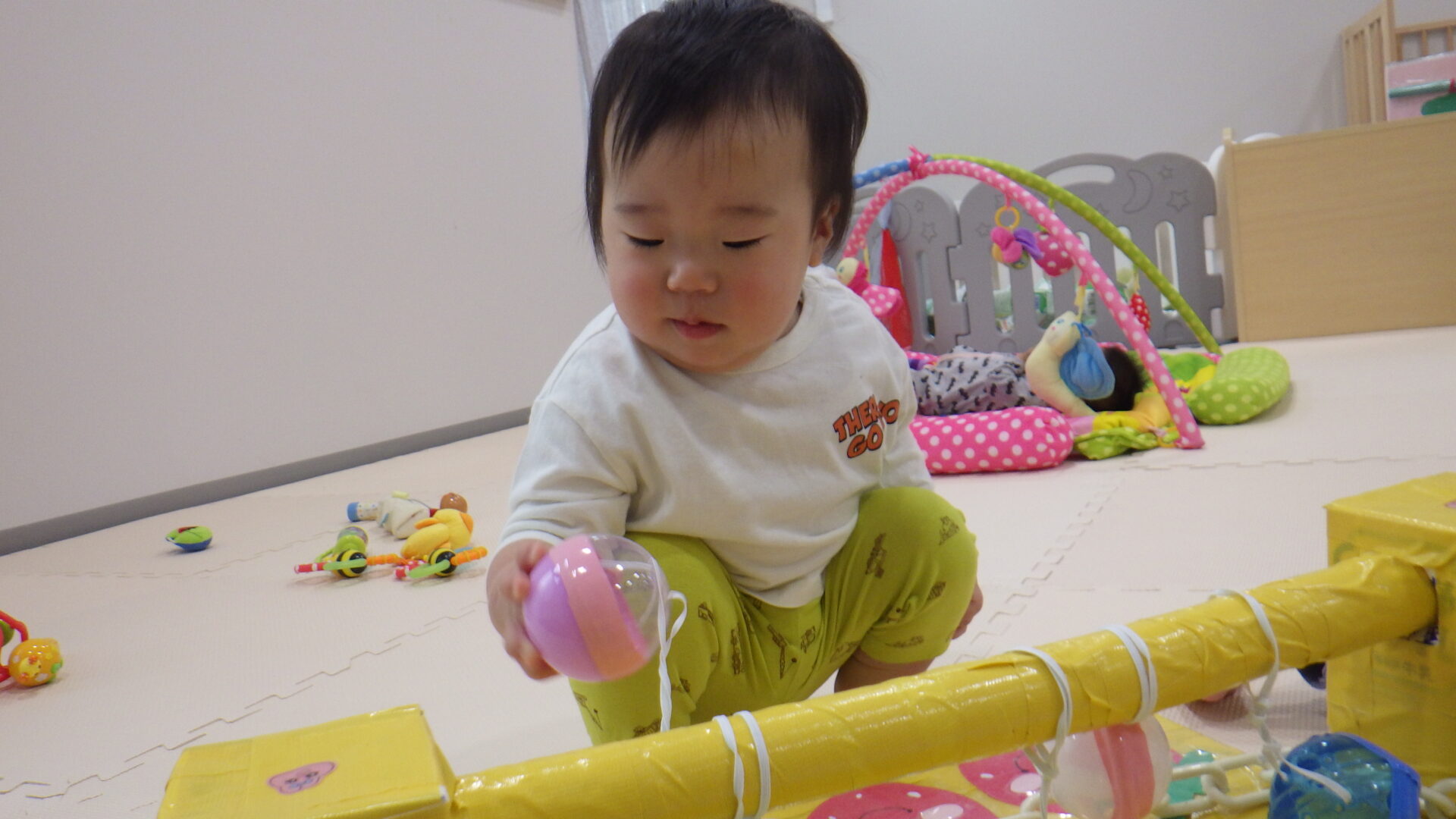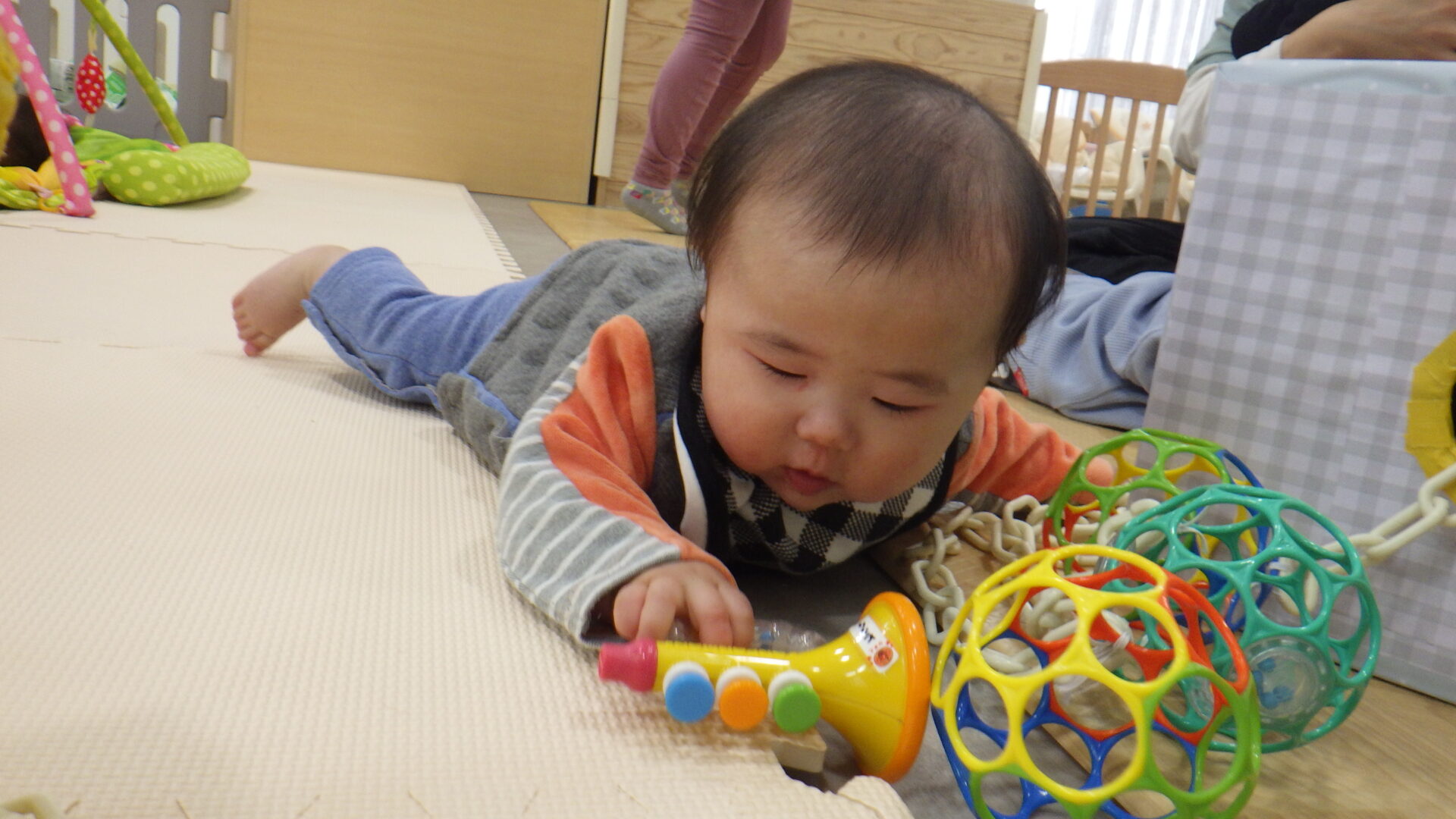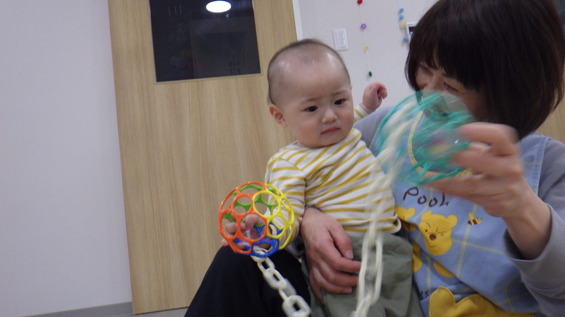 先生の膝から離れて目の前のおもちゃに興味を示す姿も、見られるようになってきました♪