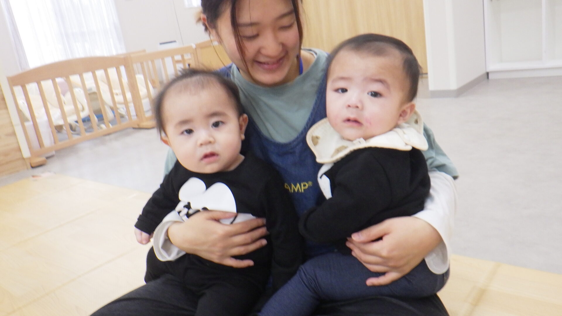 先生に抱っこしてもらうと、安心した表情のおともだち(o^―^o)
