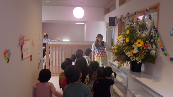 先生紹介や2階のお約束を聞いた後は、3グループに分かれて園内探検へレッツゴー!!