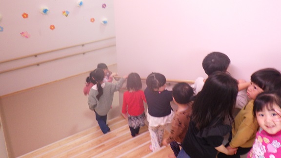 お兄さんたちの真似をして、にじ組のお友だちも上手に階段を下ります。