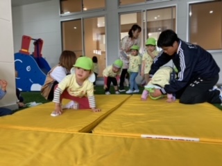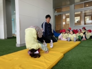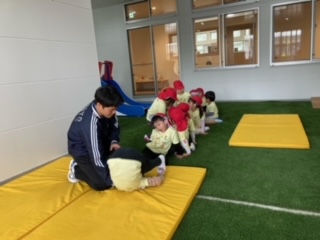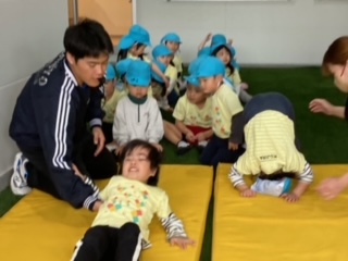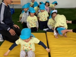 2歳児(あめ組)。体操教室の先生と一緒に体を動かした後、前回りをしました。