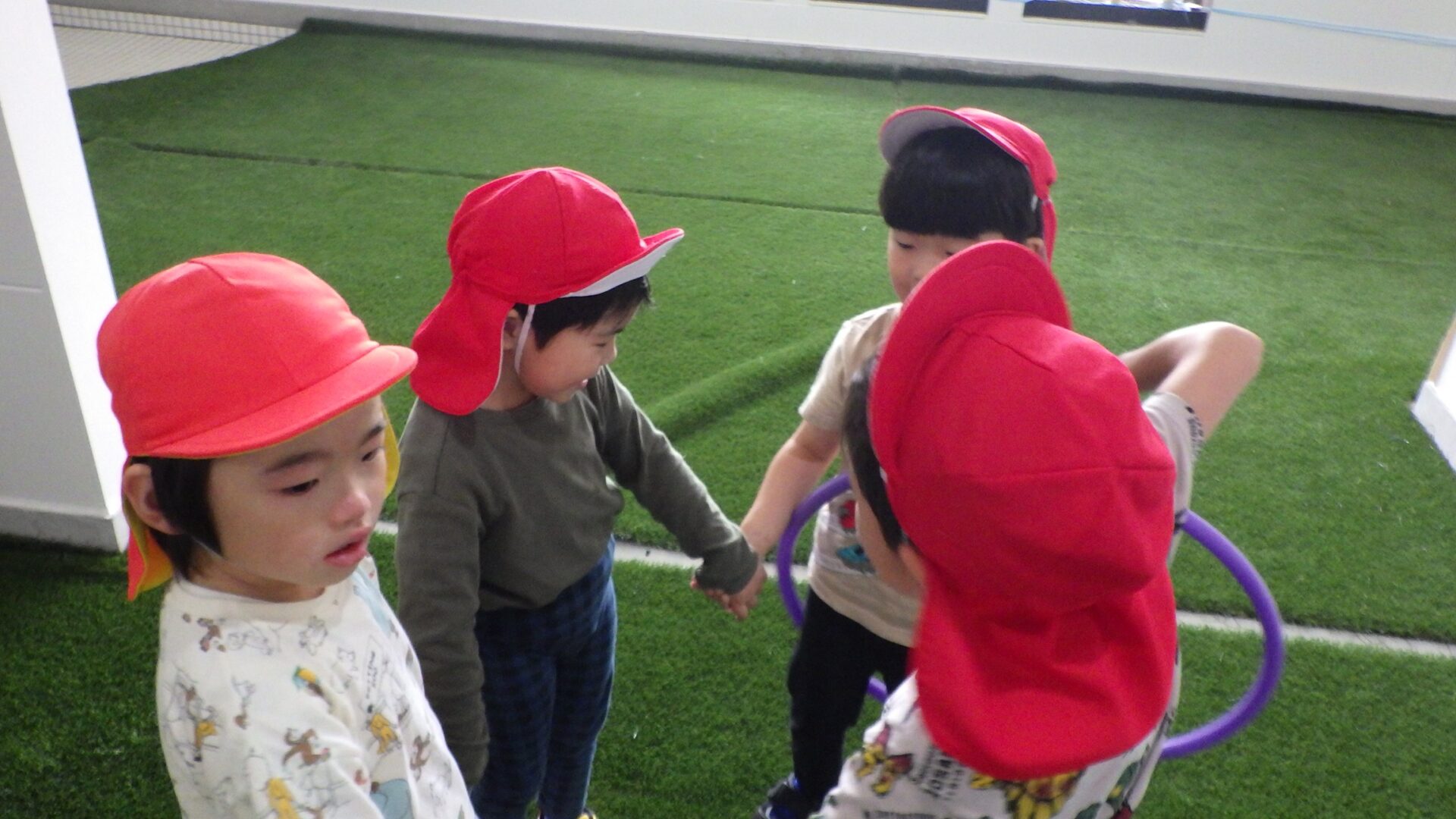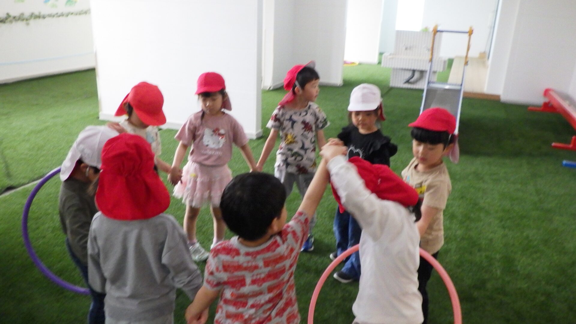 今回のフラフープ送りでは友だちと協力して成功する楽しさを知ることが出来ました。これからもゲーム遊びや保育園生活を通して友だちと協力し色んな事に挑戦していきたいと思います。