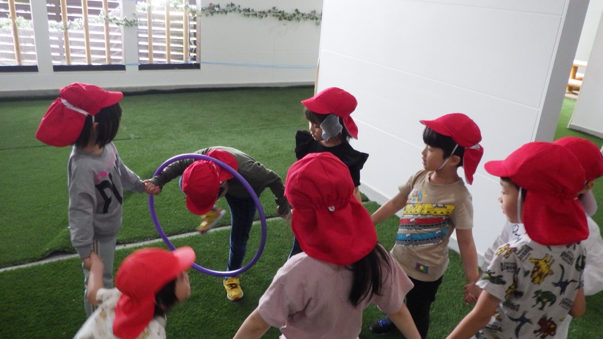 くじら組(5歳児)はフラフープを使ってゲーム遊びを行いました。初めは4人に分かれて挑戦!