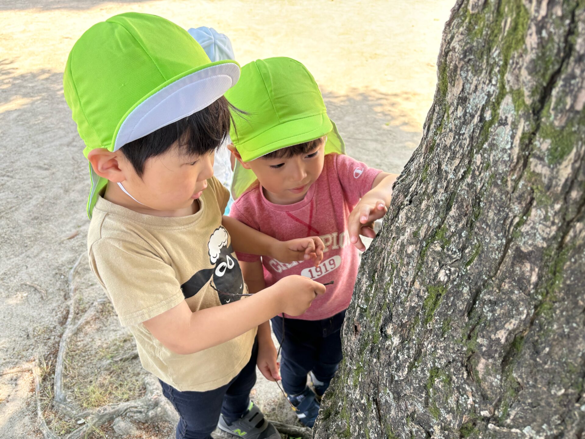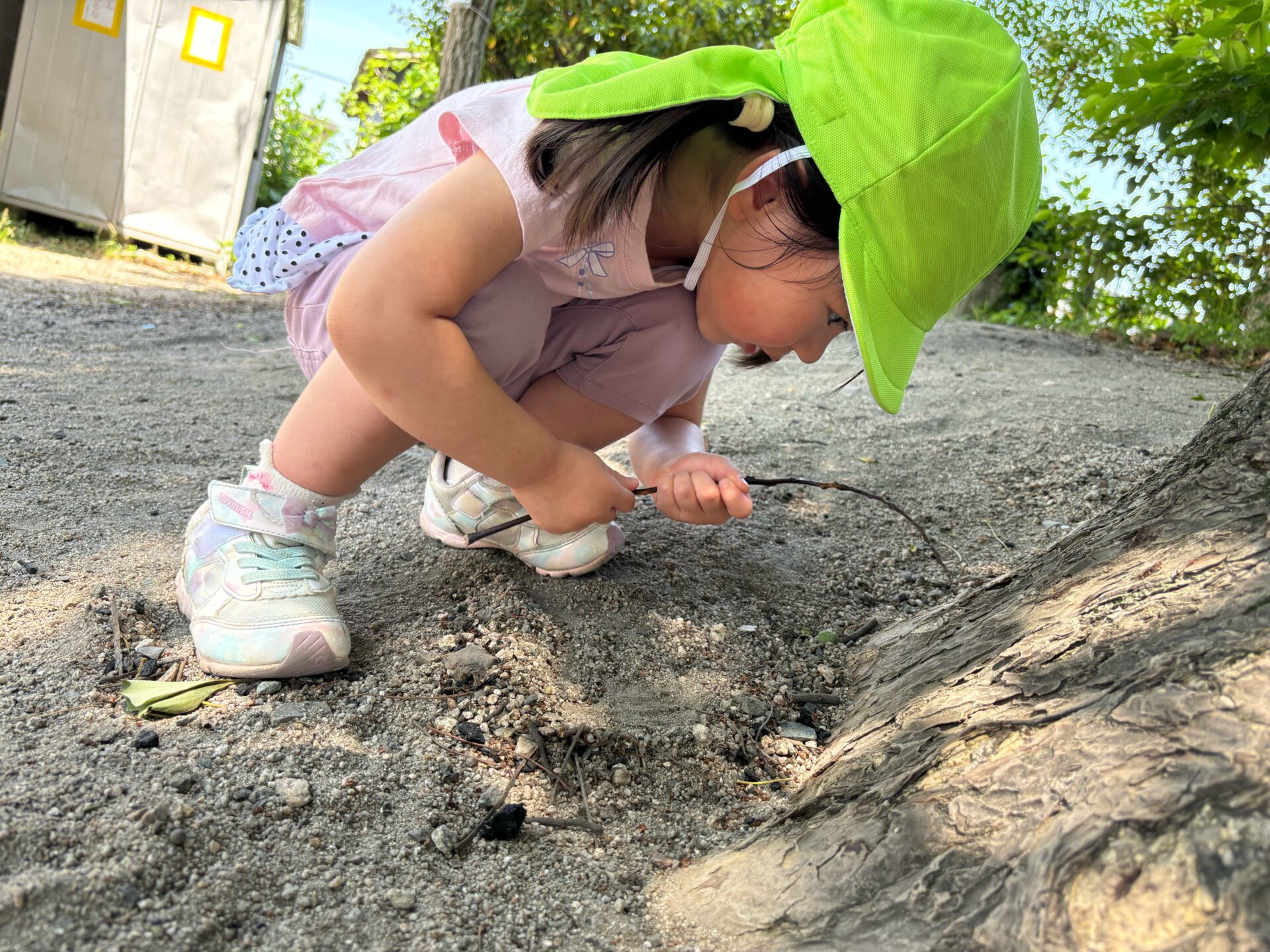 枝を見つけて木の下をつつき「アリさんいるかな~」と探すお友だち。