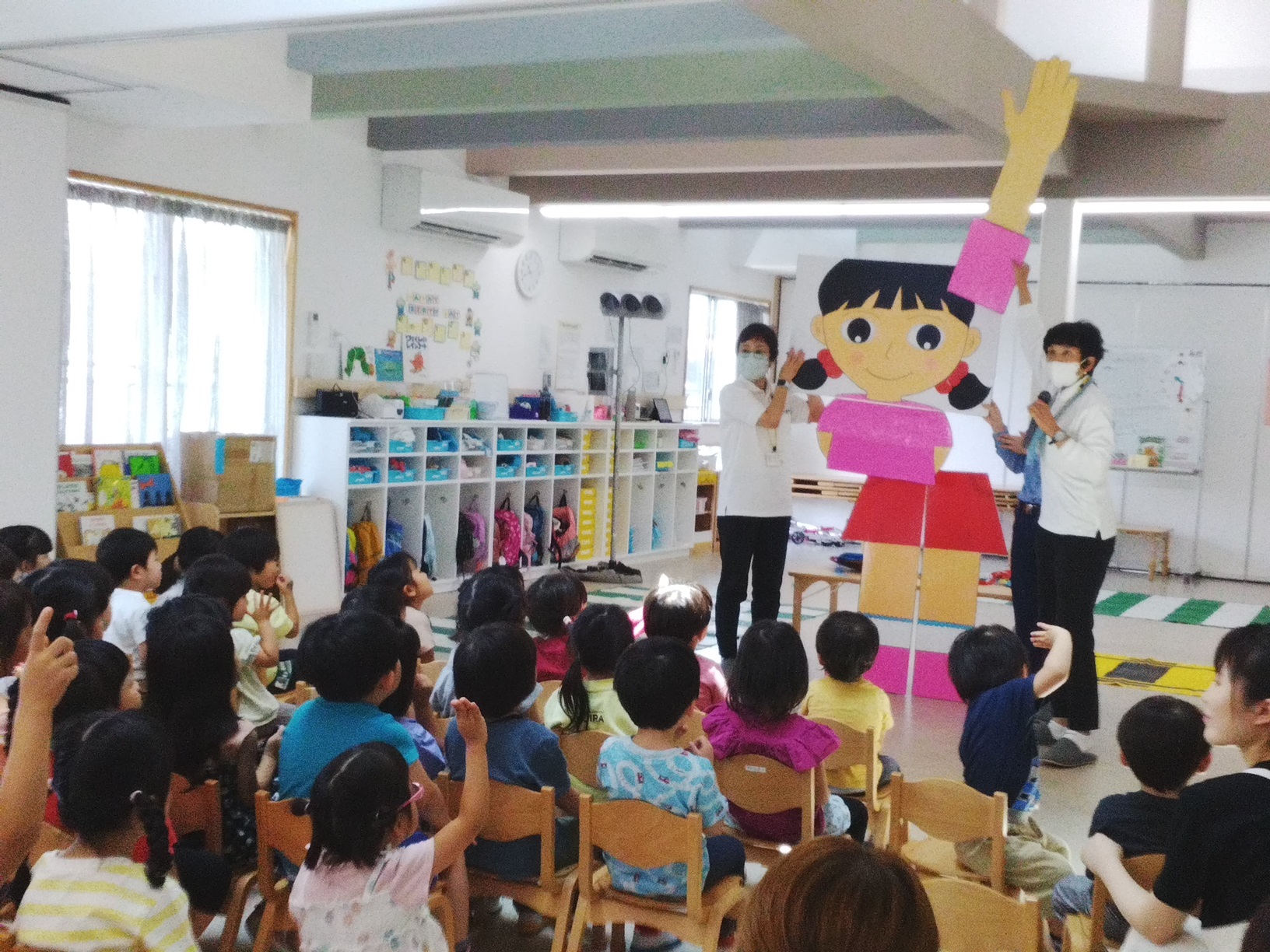 「としこちゃん人形」を使って横断歩道の渡り方についてのお話です。