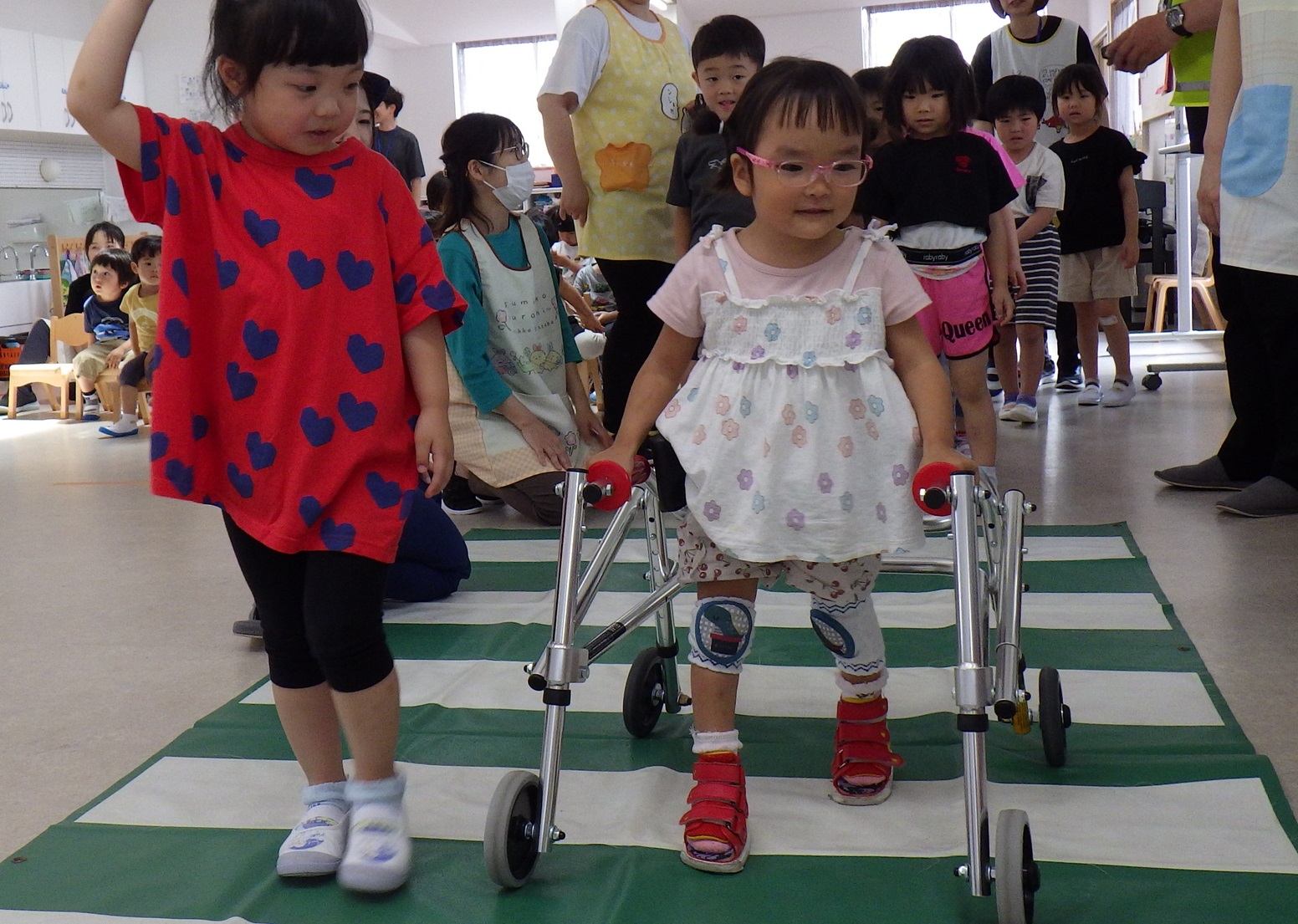 真剣な表情で横断歩道の渡り方を見るお友だち…