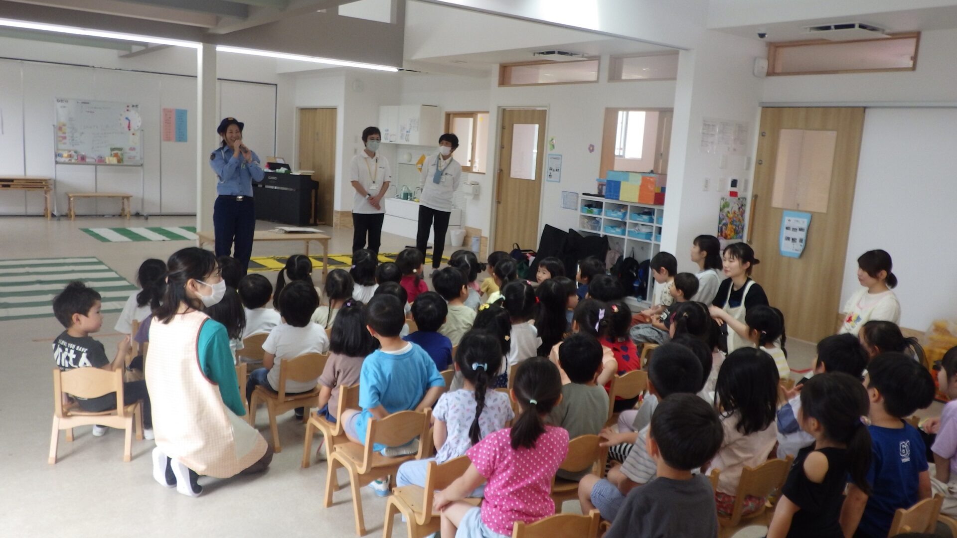 にじ組(3歳児)、そら組(4歳児)、くじら組(5歳児)のみんなで交通安全教室に参加しました。