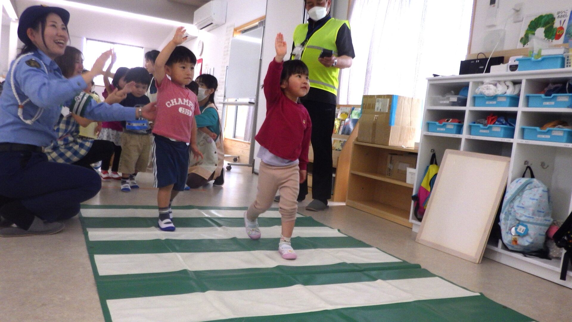 「手をしっかり上げて…」警察官の方と保育士と確認しながら上手に渡ることが出来ました!(にじ組)