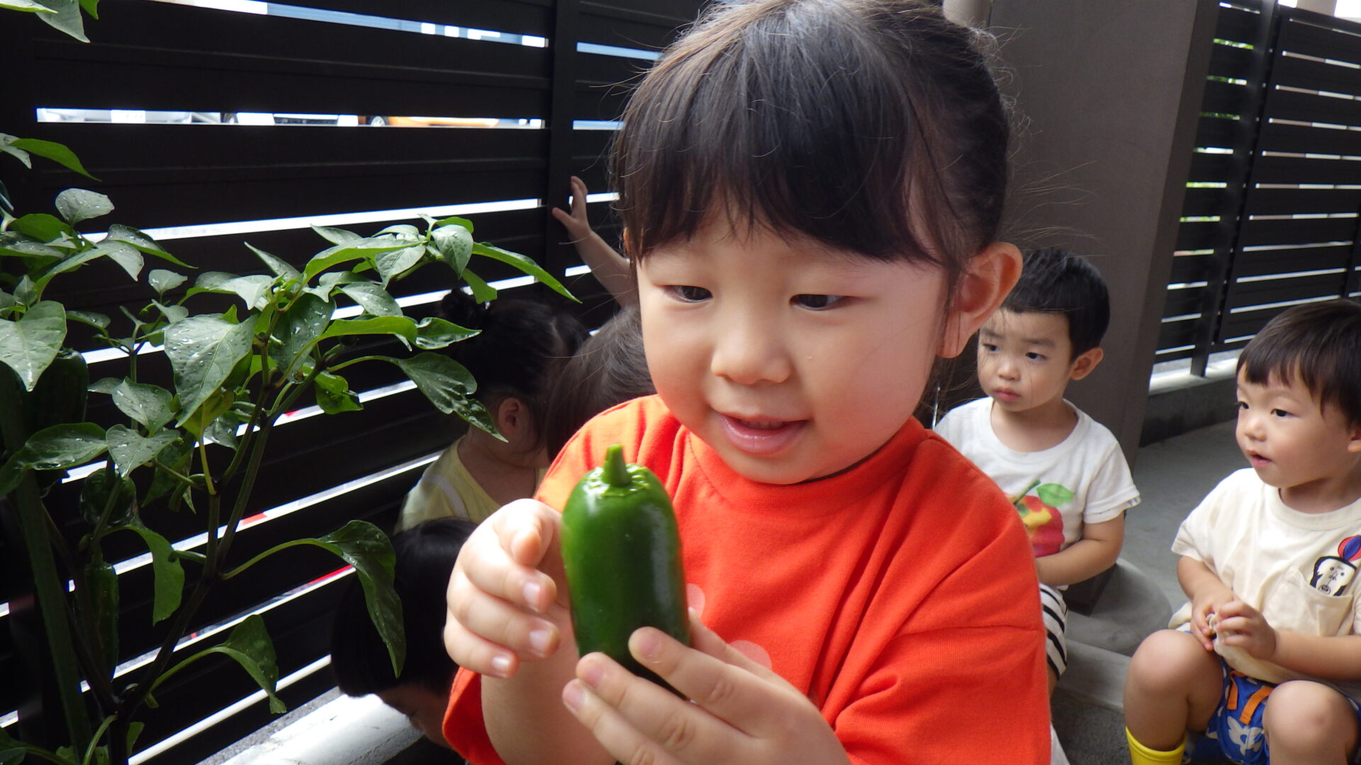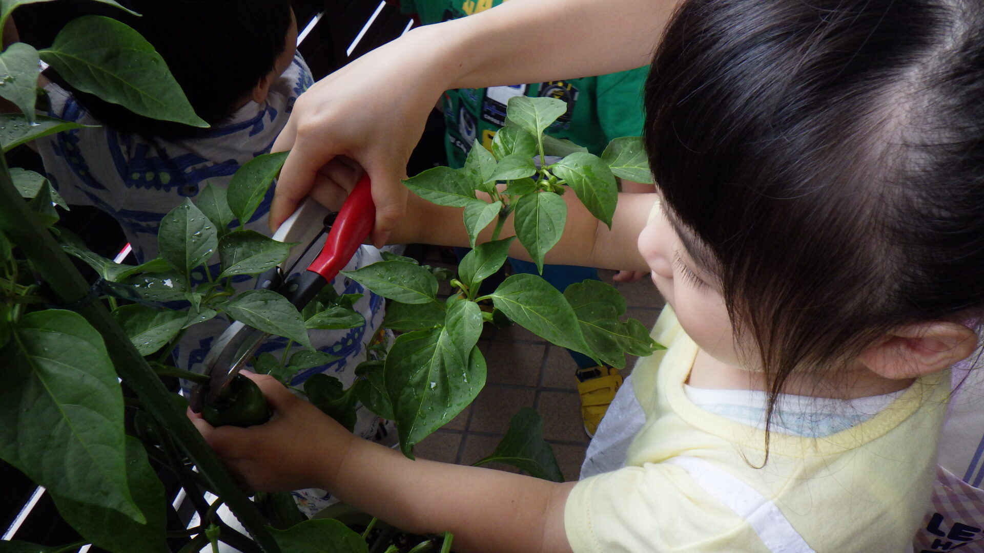 ピーマンの収穫を楽しみに待っていたあめ組(2歳児)の子どもたち。