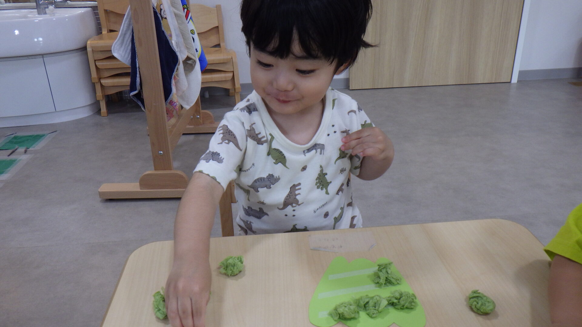 花紙を両手でくしゃくしゃと丸め、ピーマンの形の台紙にぺたっ。