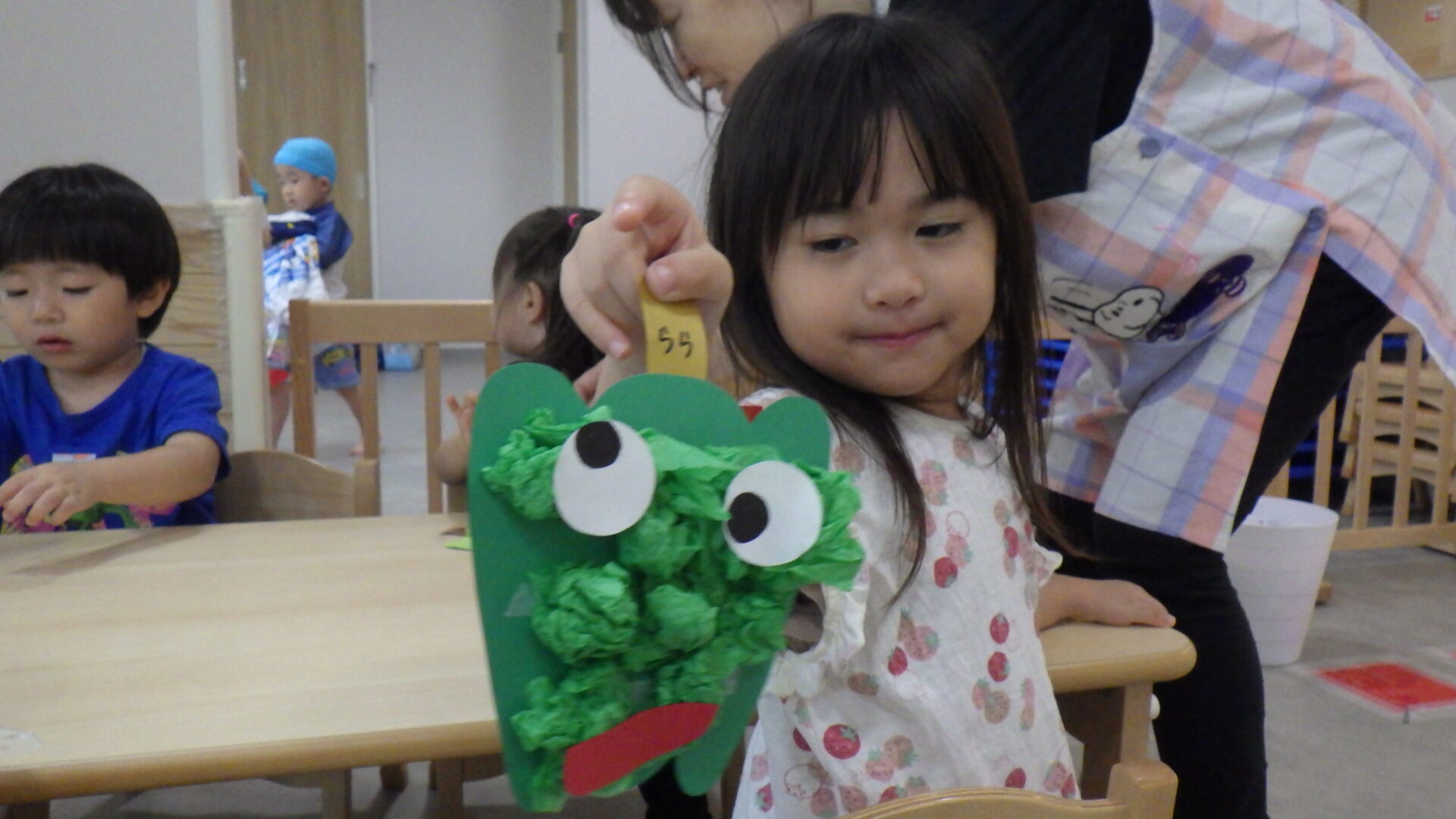 保育士と一緒にはさみを使ってチョキン。