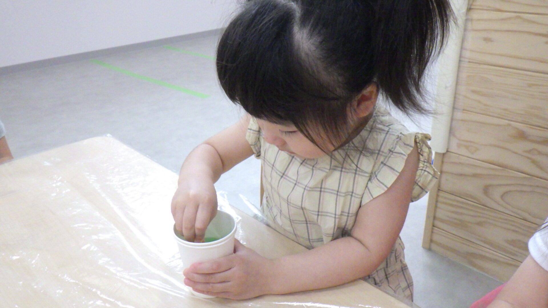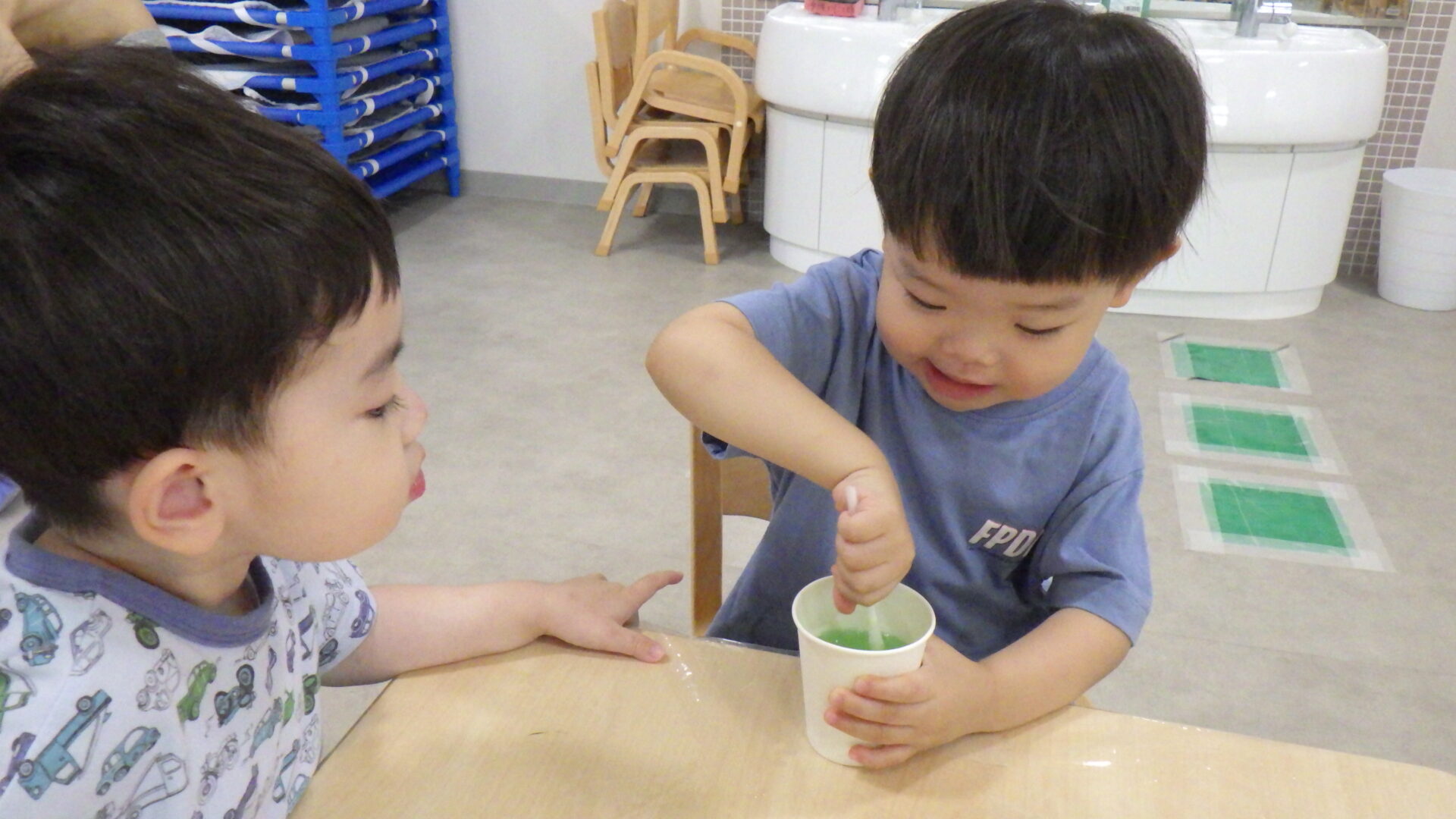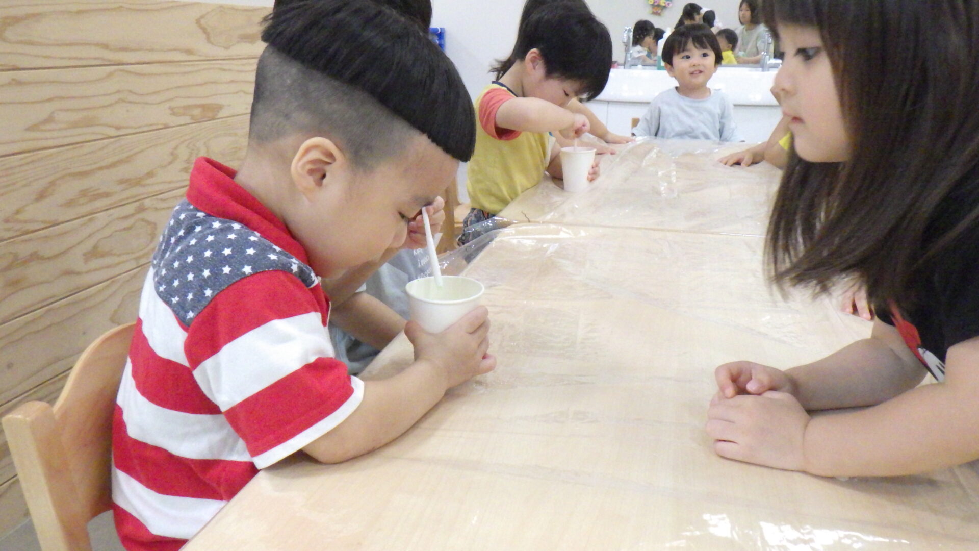 しっかり紙コップを支えながら混ぜていますね!