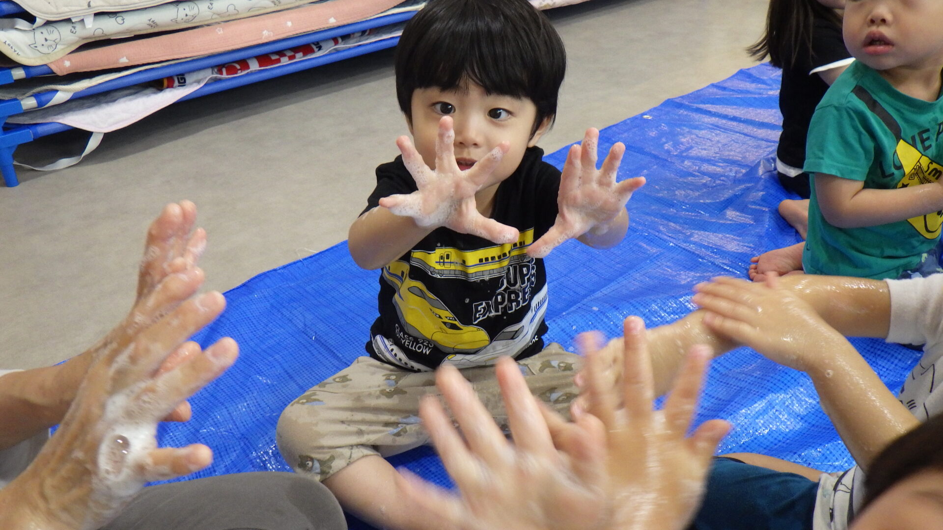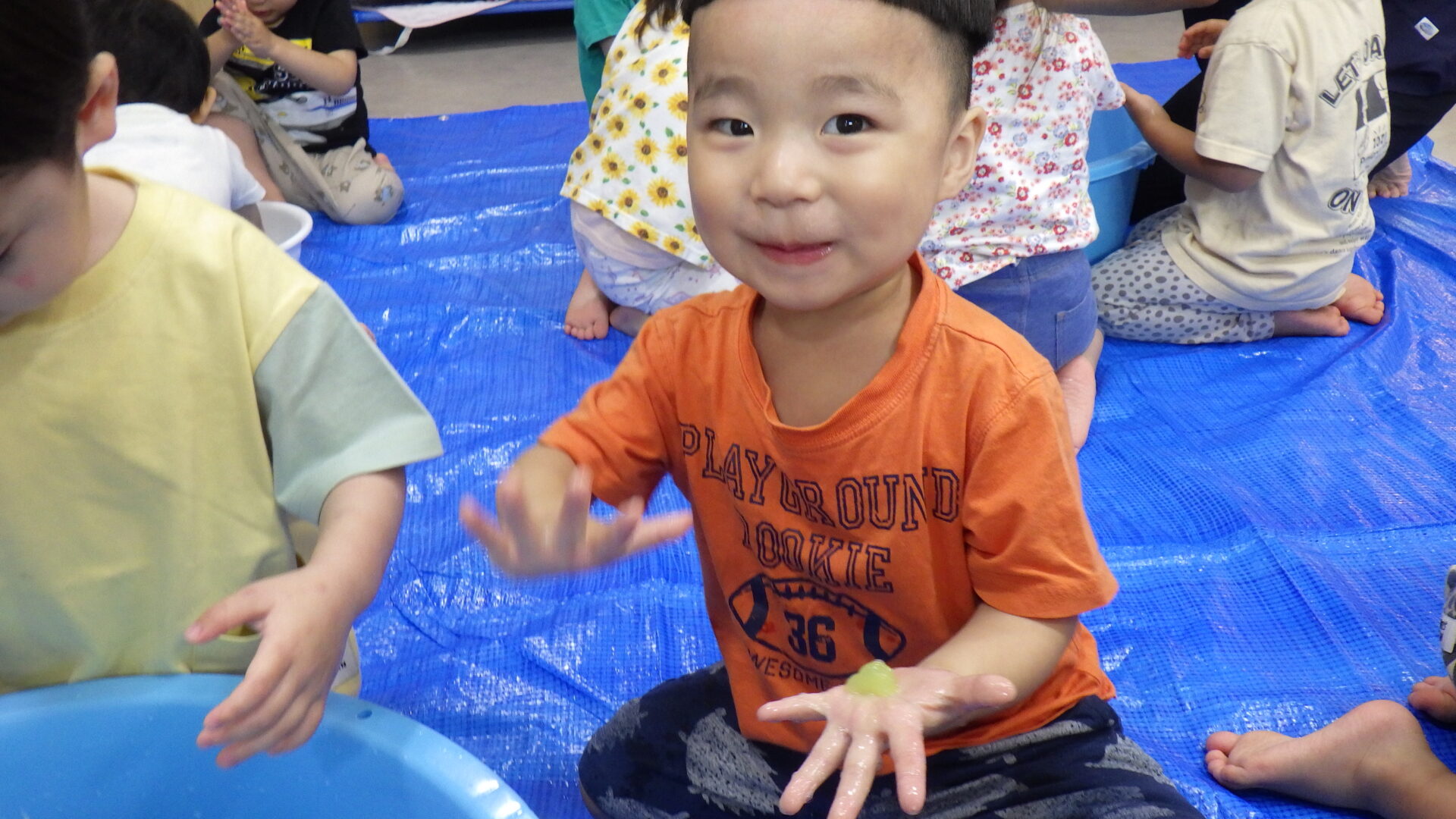 ゼリーせっけんを手にのせてみると、「なんかプニプニしてる・・」と戸惑いの表情を見せる子や、「いい匂いがするよ!」と匂いをかがせてくれる子など、反応は様々でした。