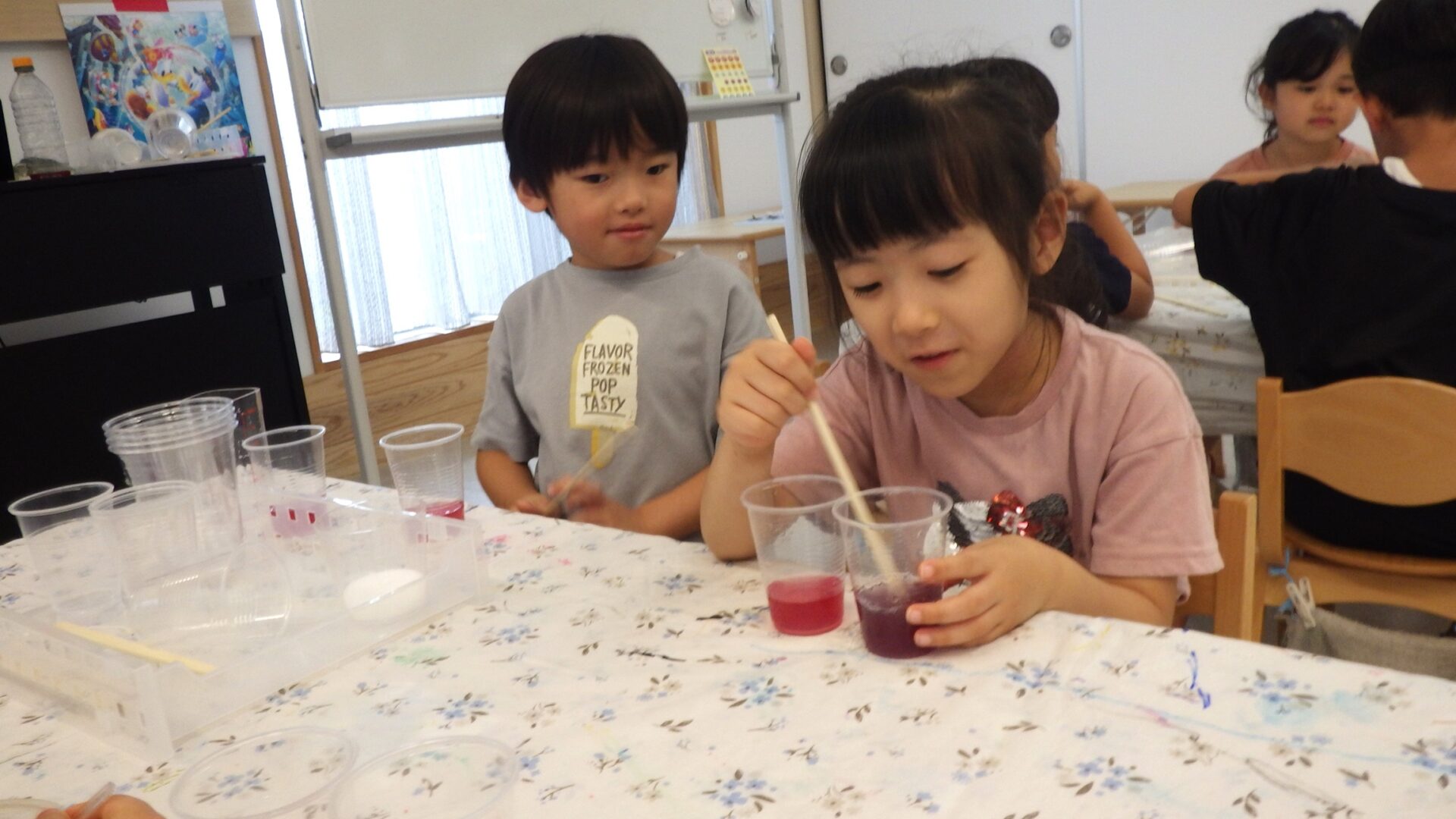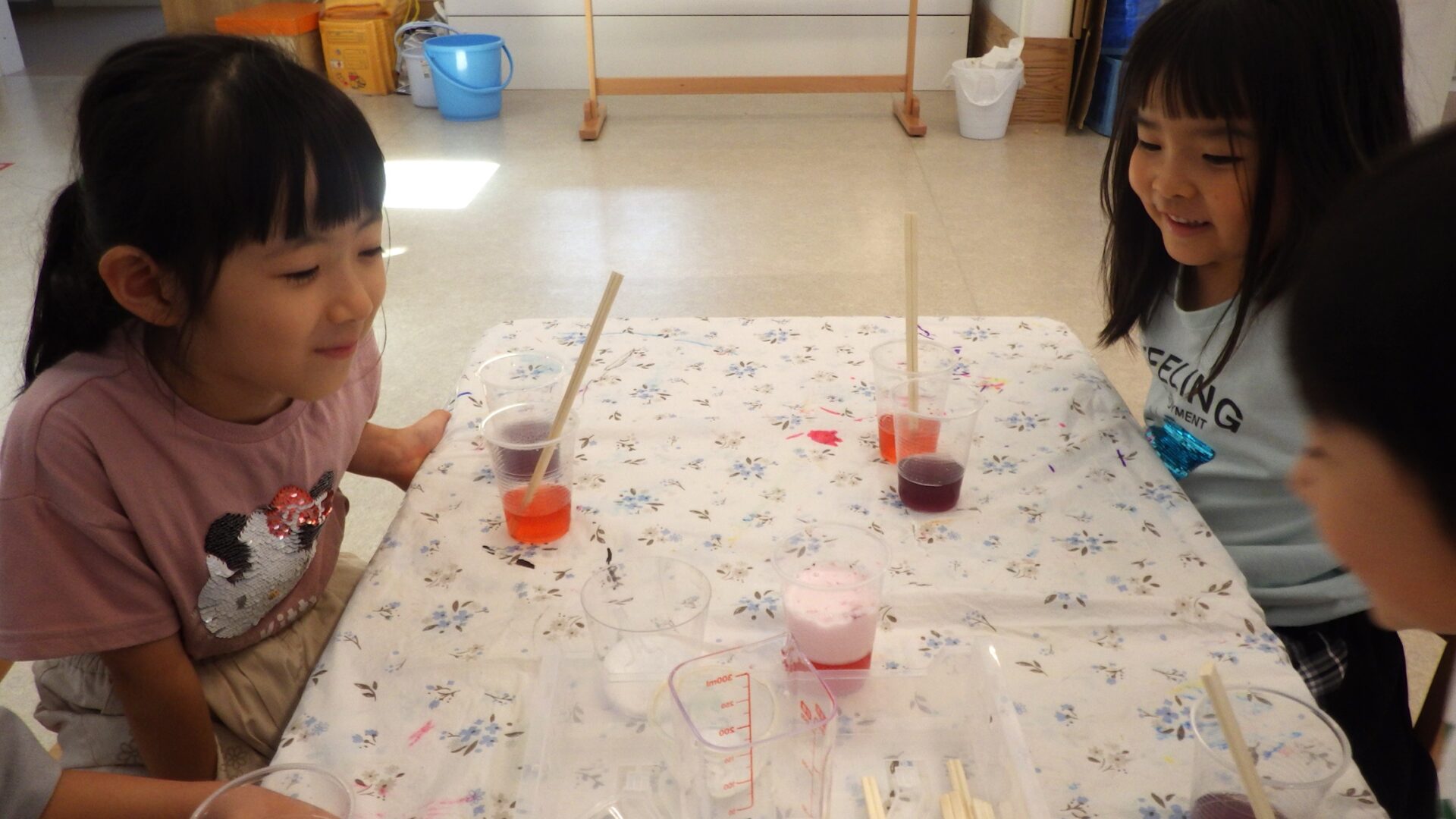 次回は、今回作った色水が何に変身するのかな?。お楽しみに!