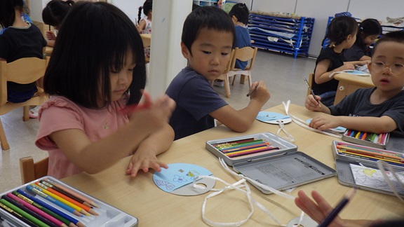 なつまつりごっこへの期待感を高めながら、好きな絵を描いたり模様を付けたりして、マイうちわを作っていきます。