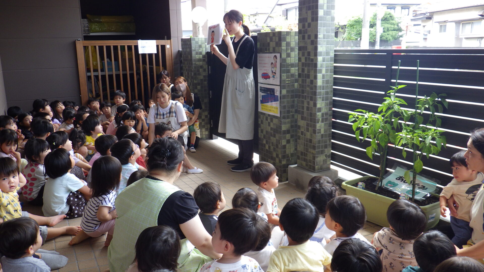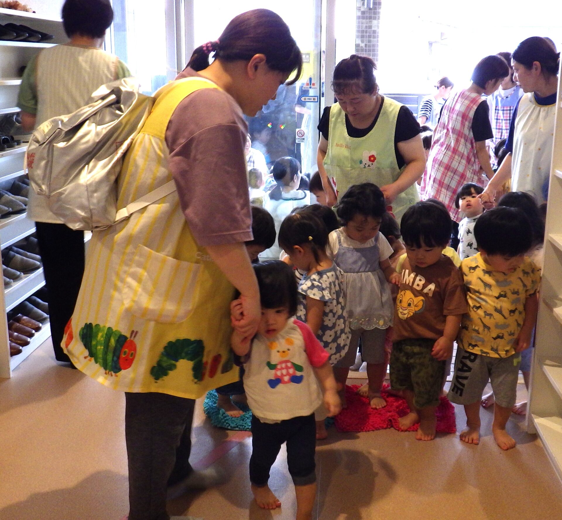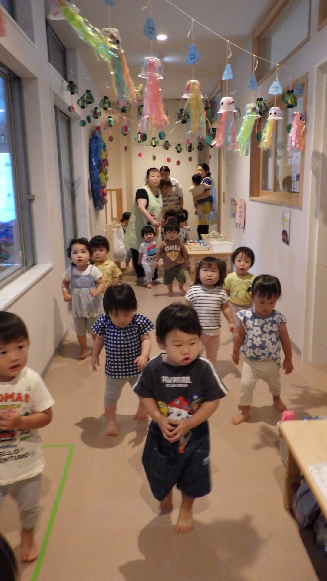 と言いながら、落ち着いて避難する、だいち組(1歳児)の子どもたち。