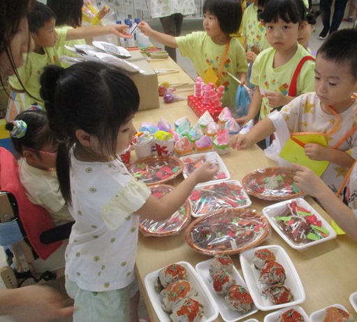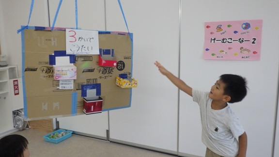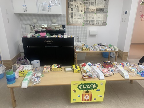 そら・くじら組のお友だちが作った景品がズラリと並んでいます。