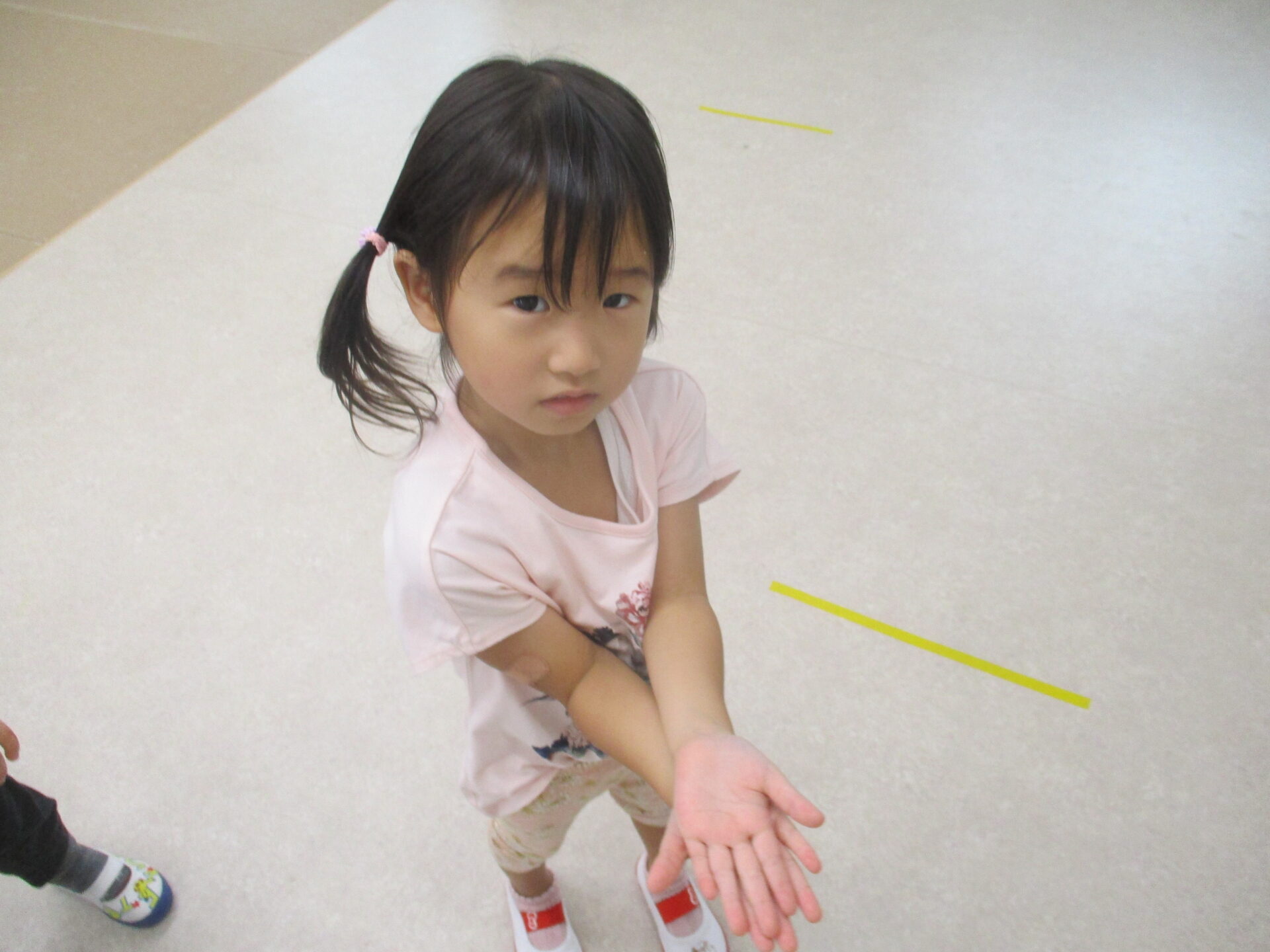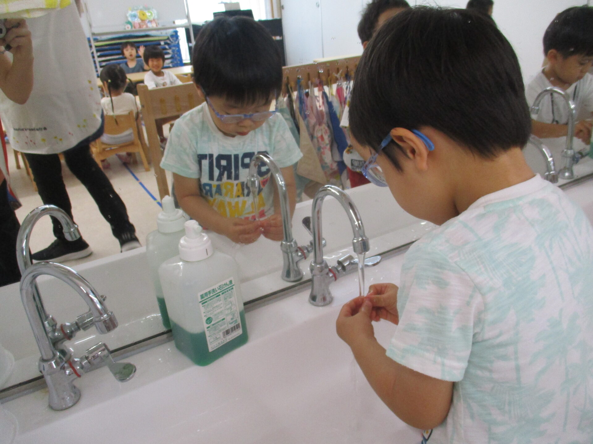 にじ組(3歳児)では、午前の活動が終わりお腹がペコペコの子どもたち…