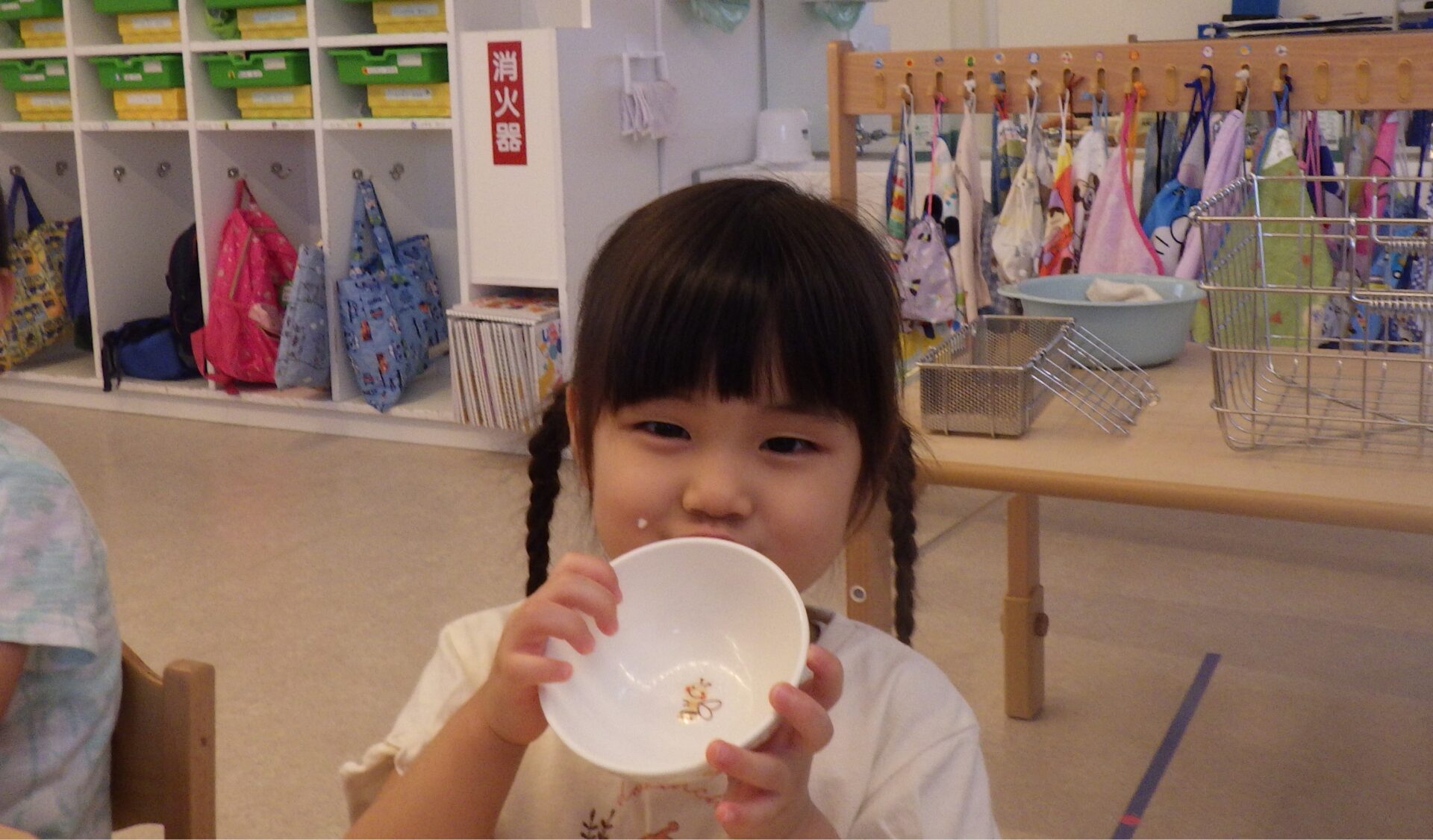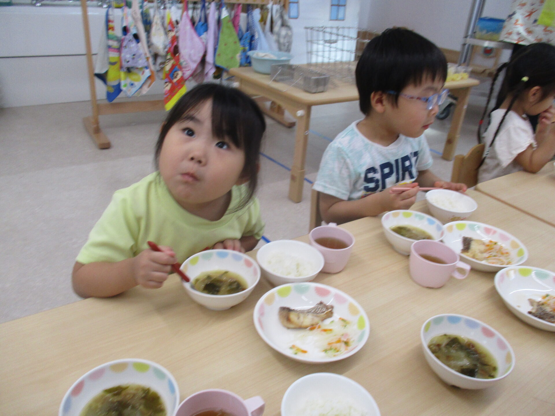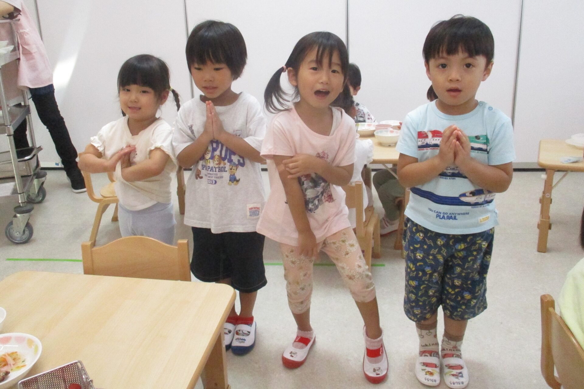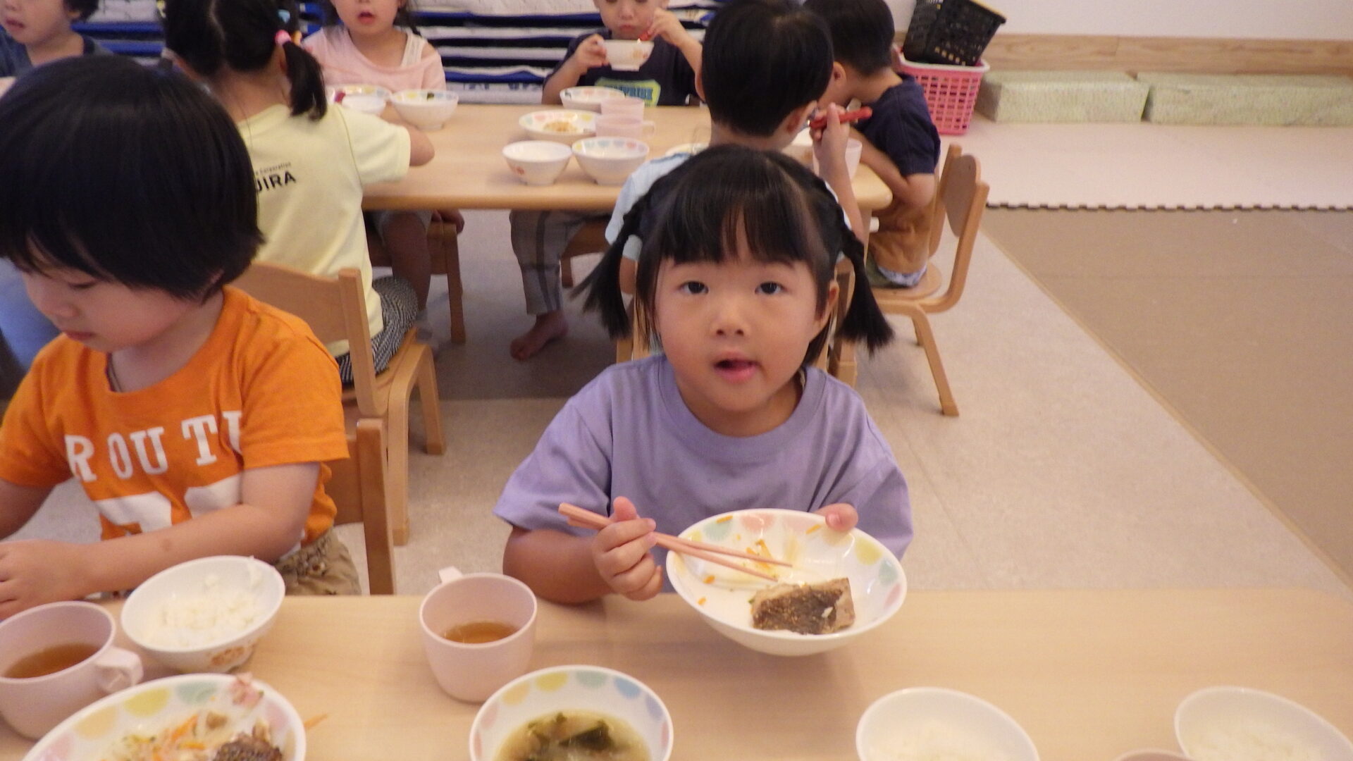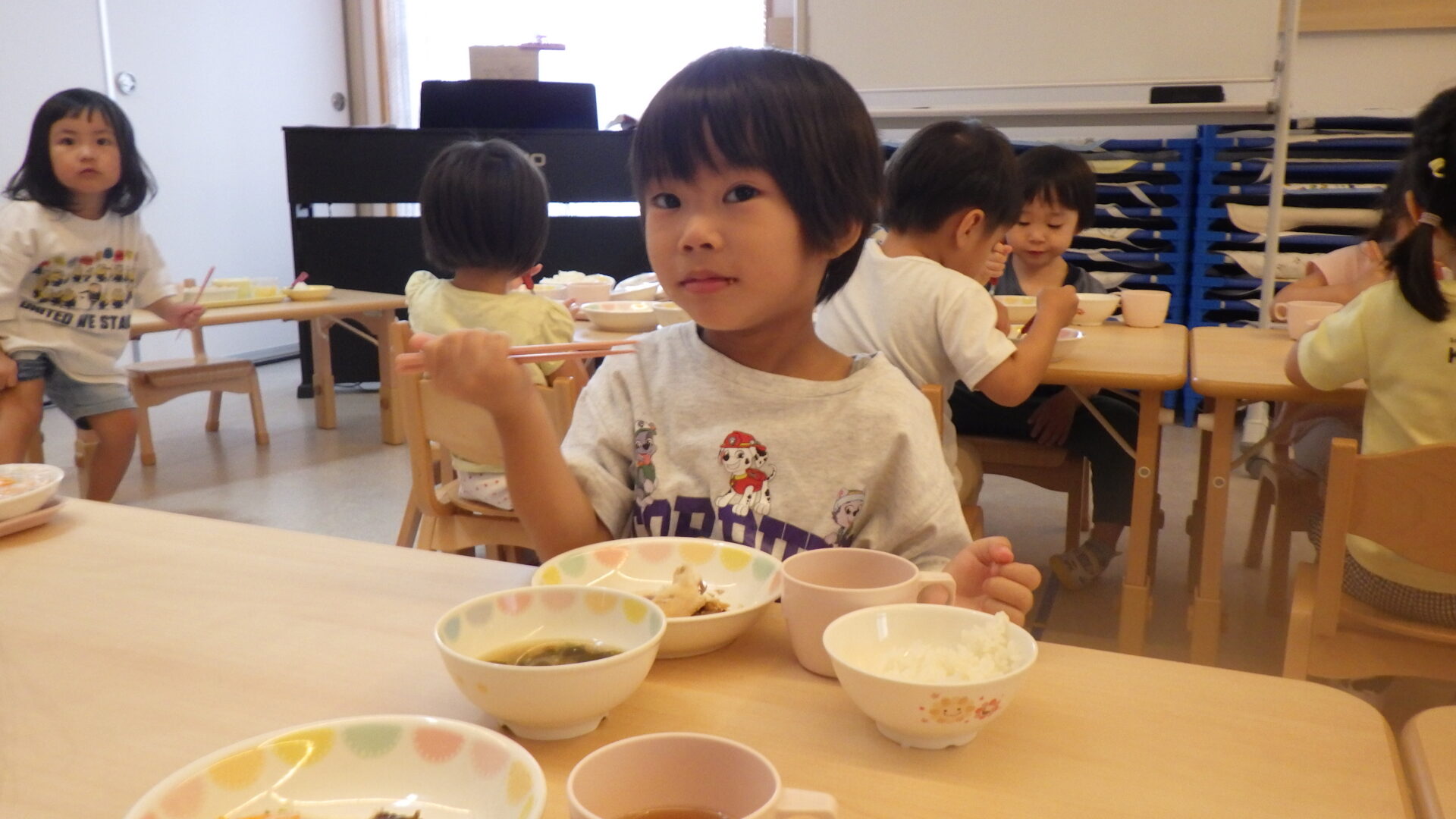 今日もいっぱい食べて、デザートのパインまでぺろりと完食したにじ組(3歳児)の子どもたちでした。