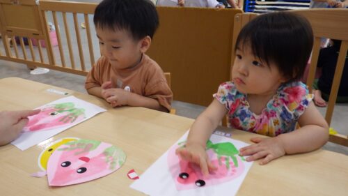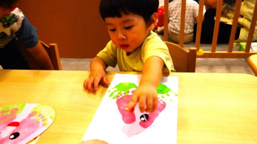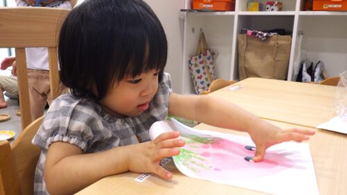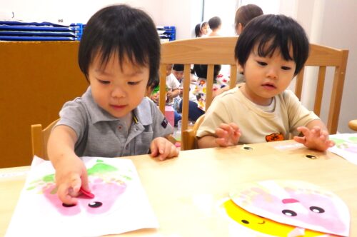 シール貼りや、手形・足形スタンプにも慣れて、画用紙にスタンプを付ける感触を楽しみます。