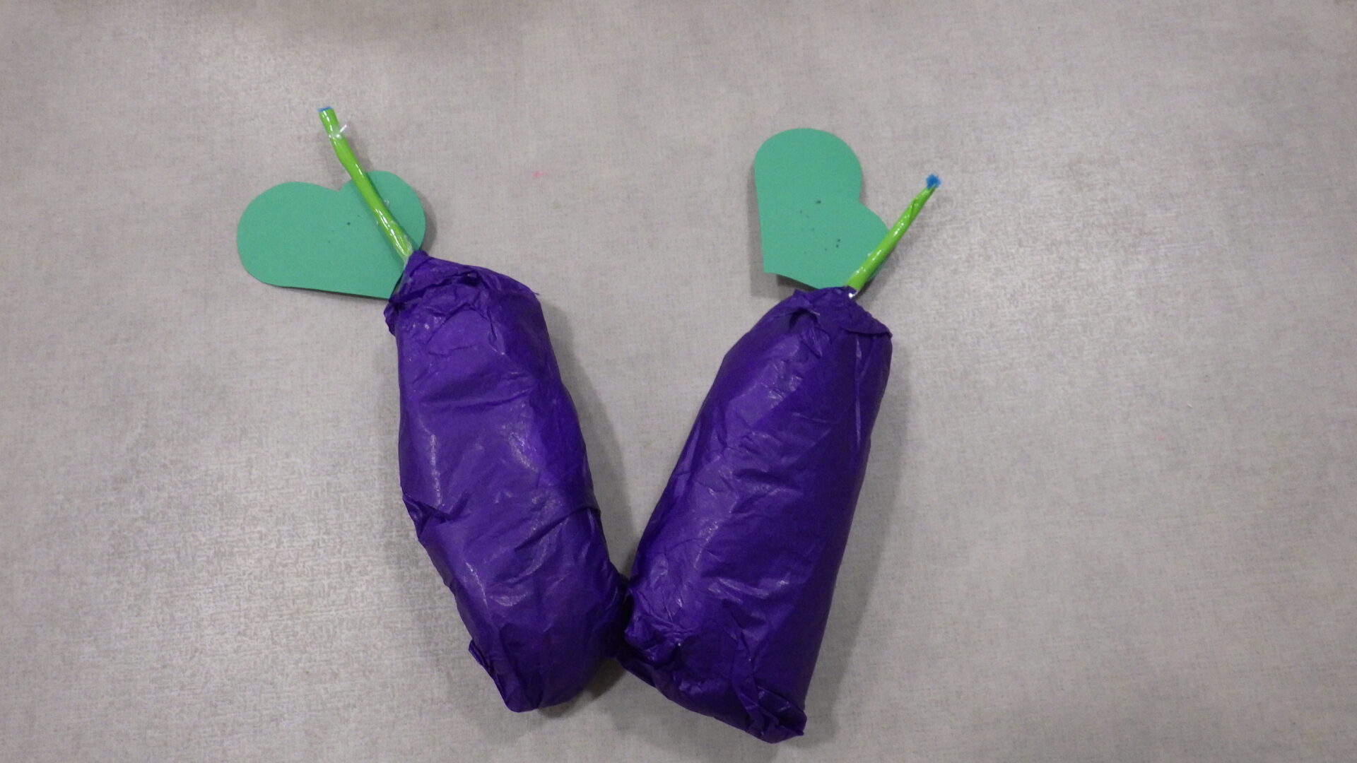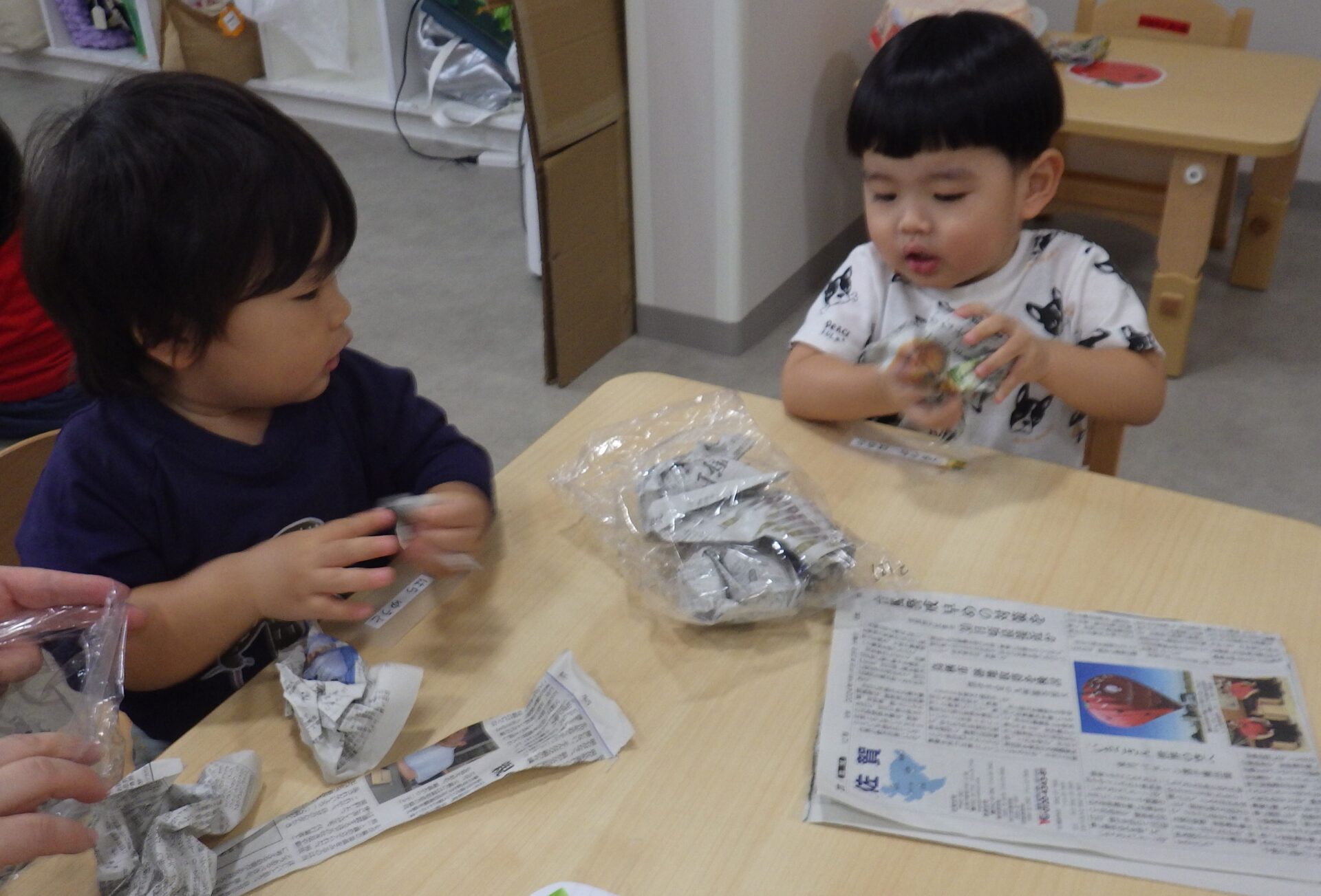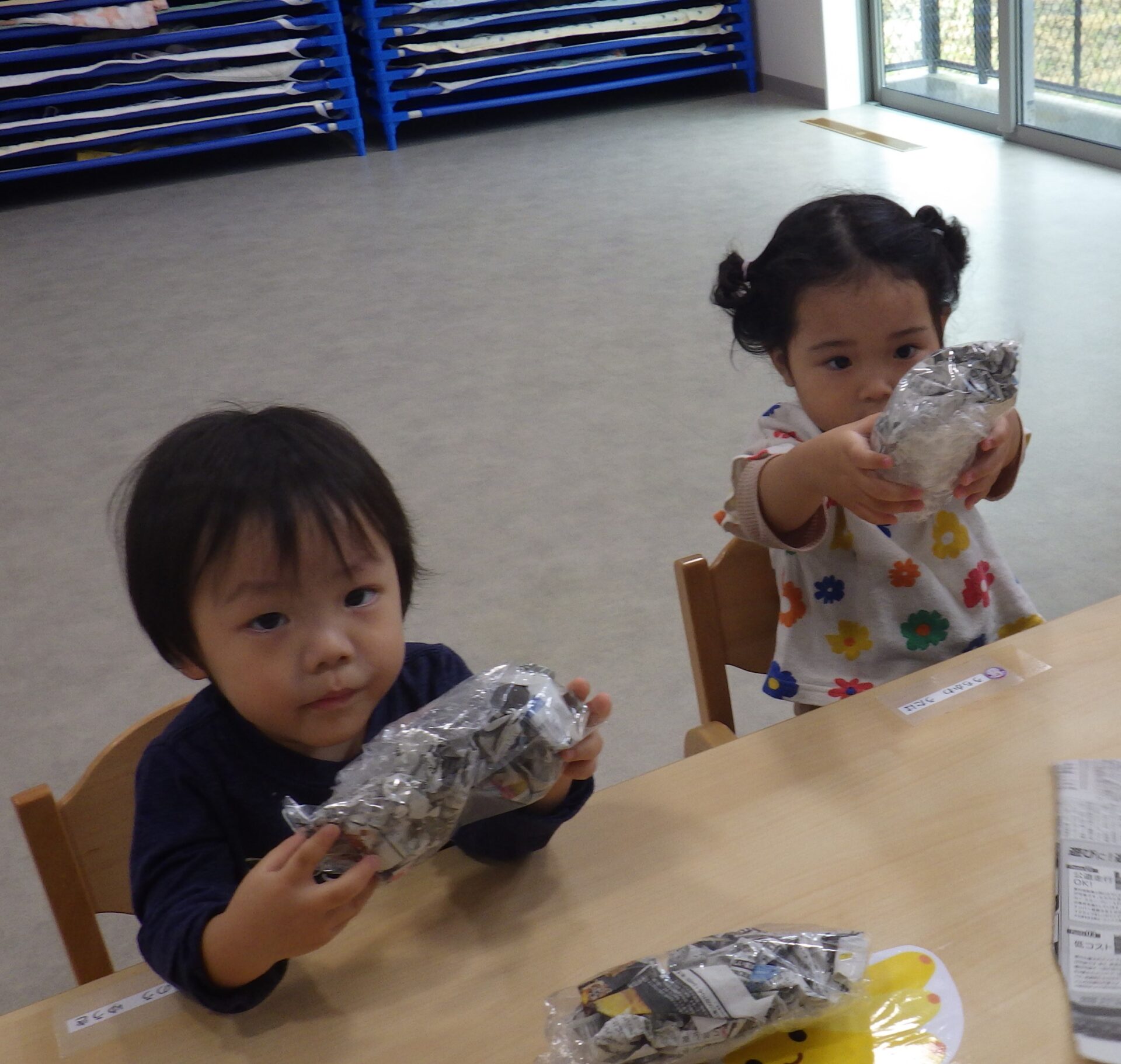 「新聞紙を丸めて、袋に入れて、手作りお芋を作ろう」と提案すると、