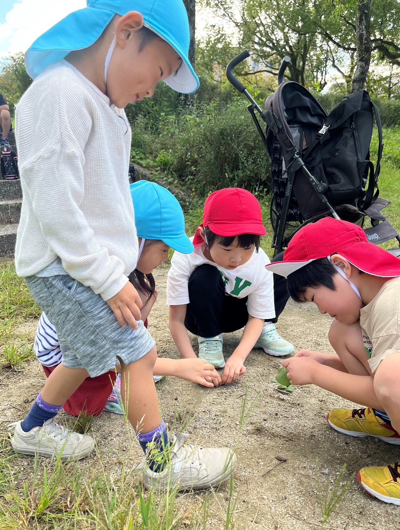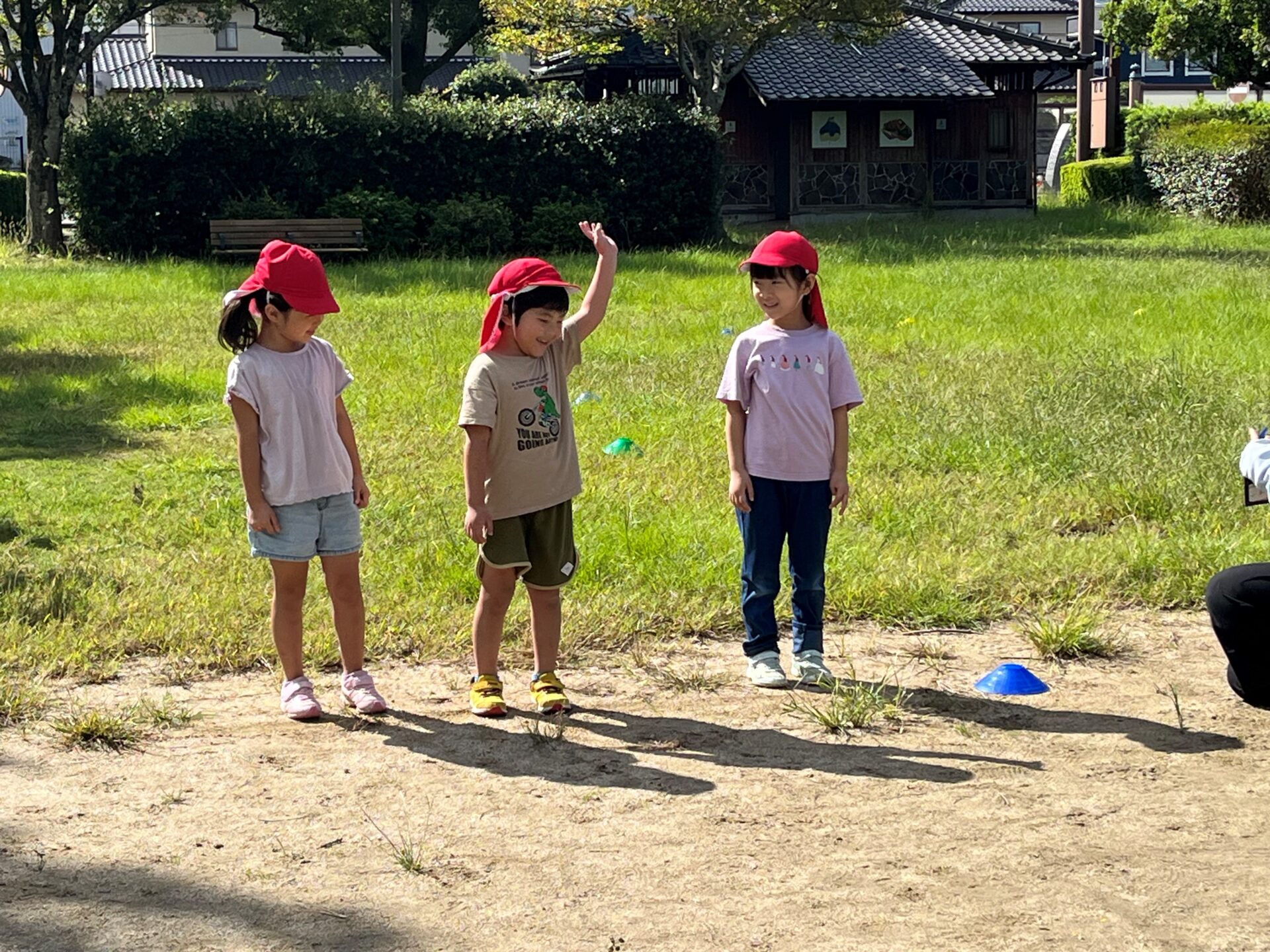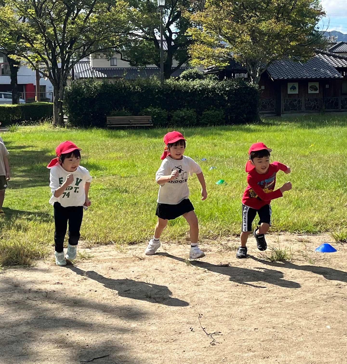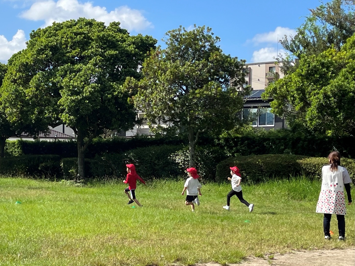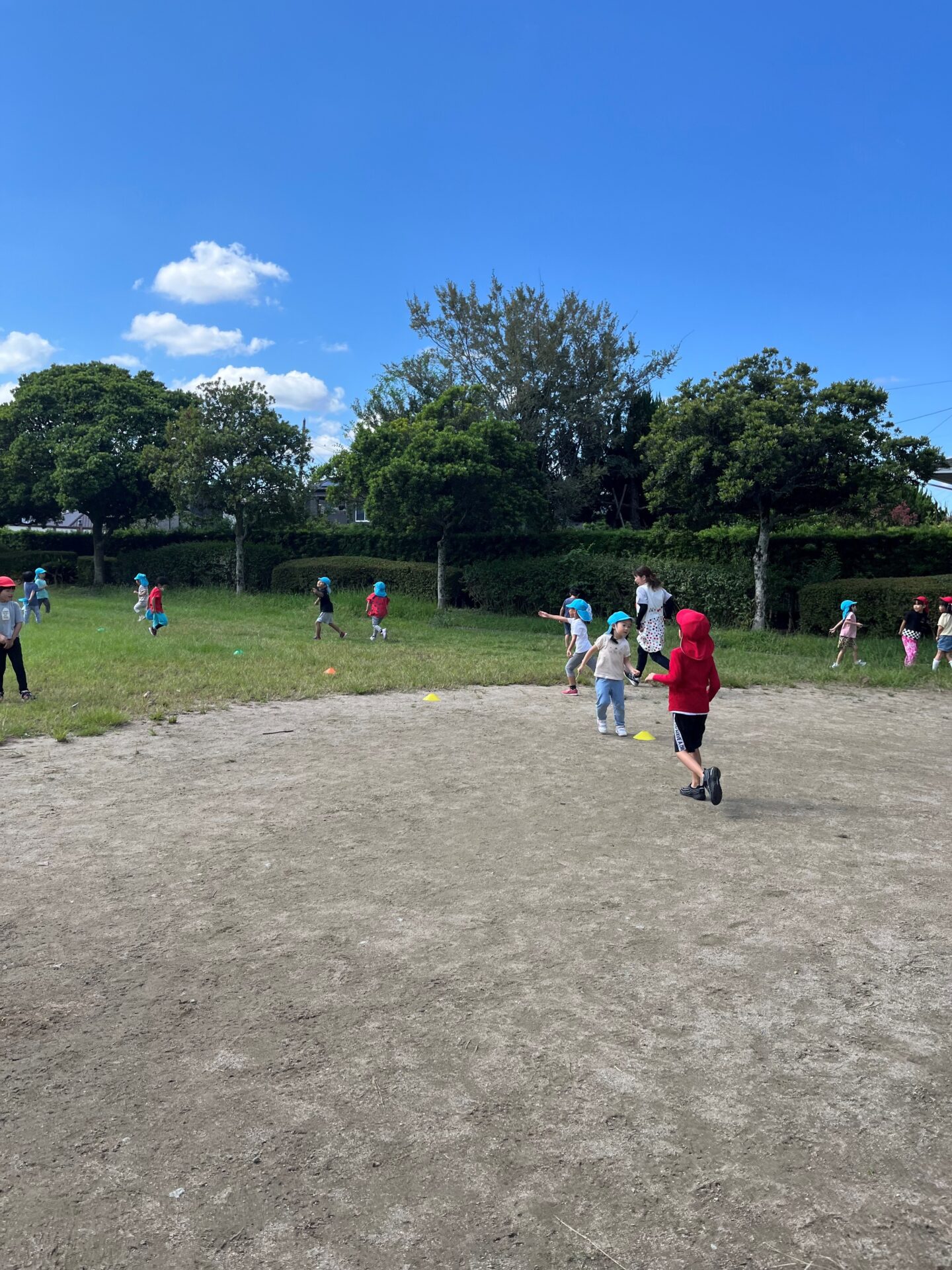 今日は通古賀近隣公園へそら組(4歳児)くじら組(5歳児)合同で、かけっこの練習も兼ねて遊びに行きました。