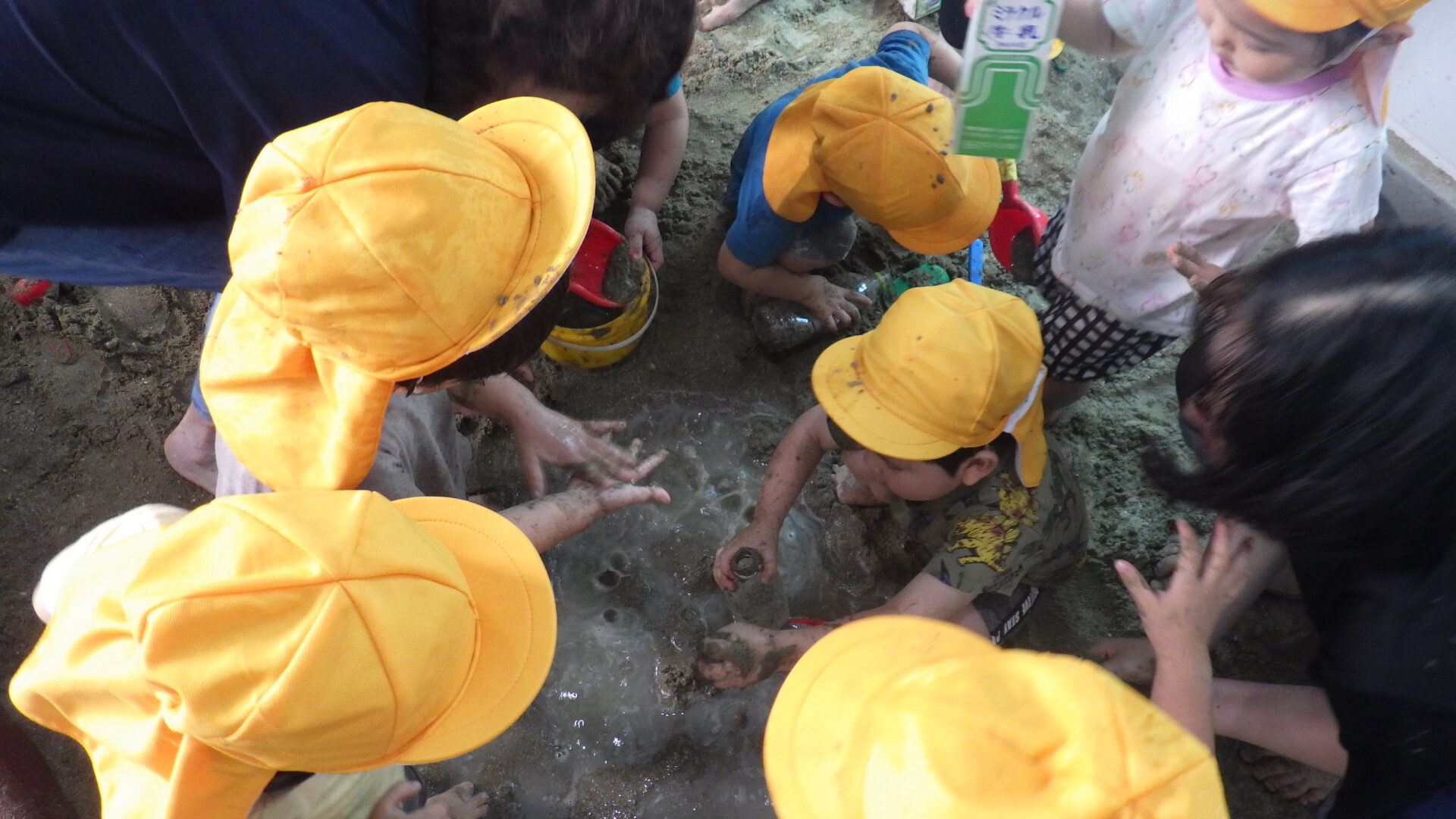 待ちに待った泥んこ遊びの時間が始まると、子どもたちは砂場へ駆け込み大賑わい