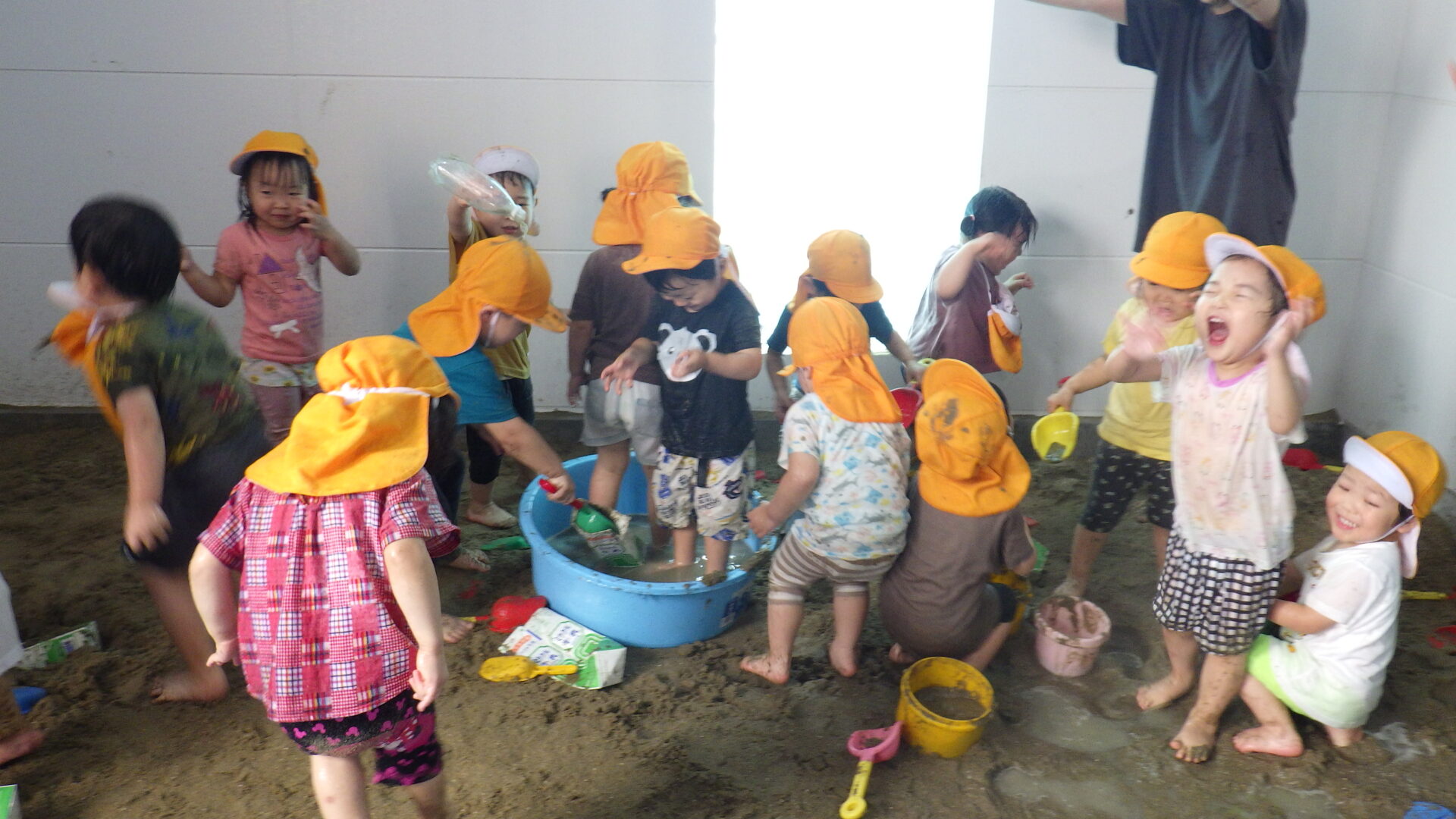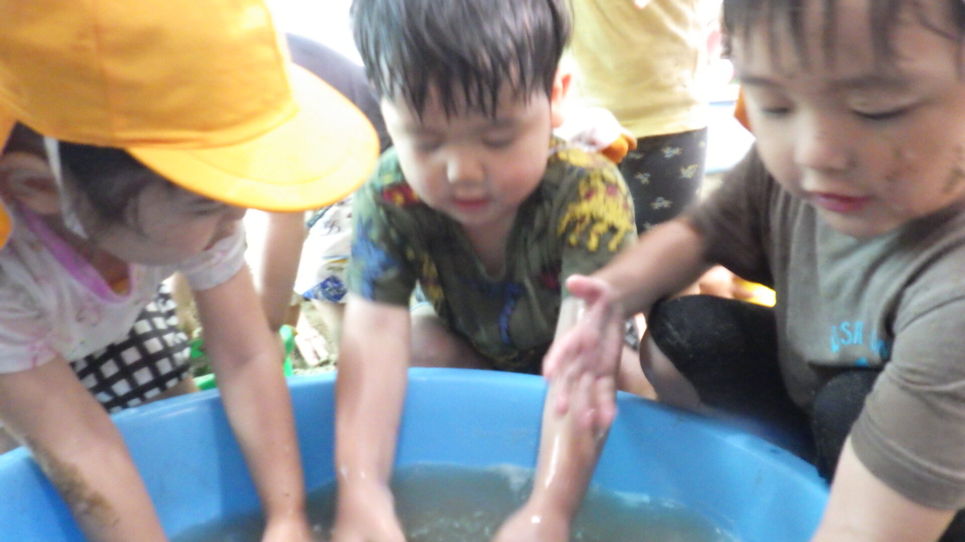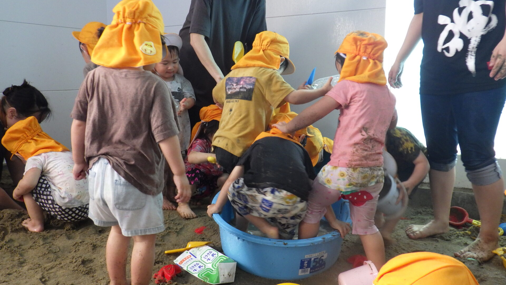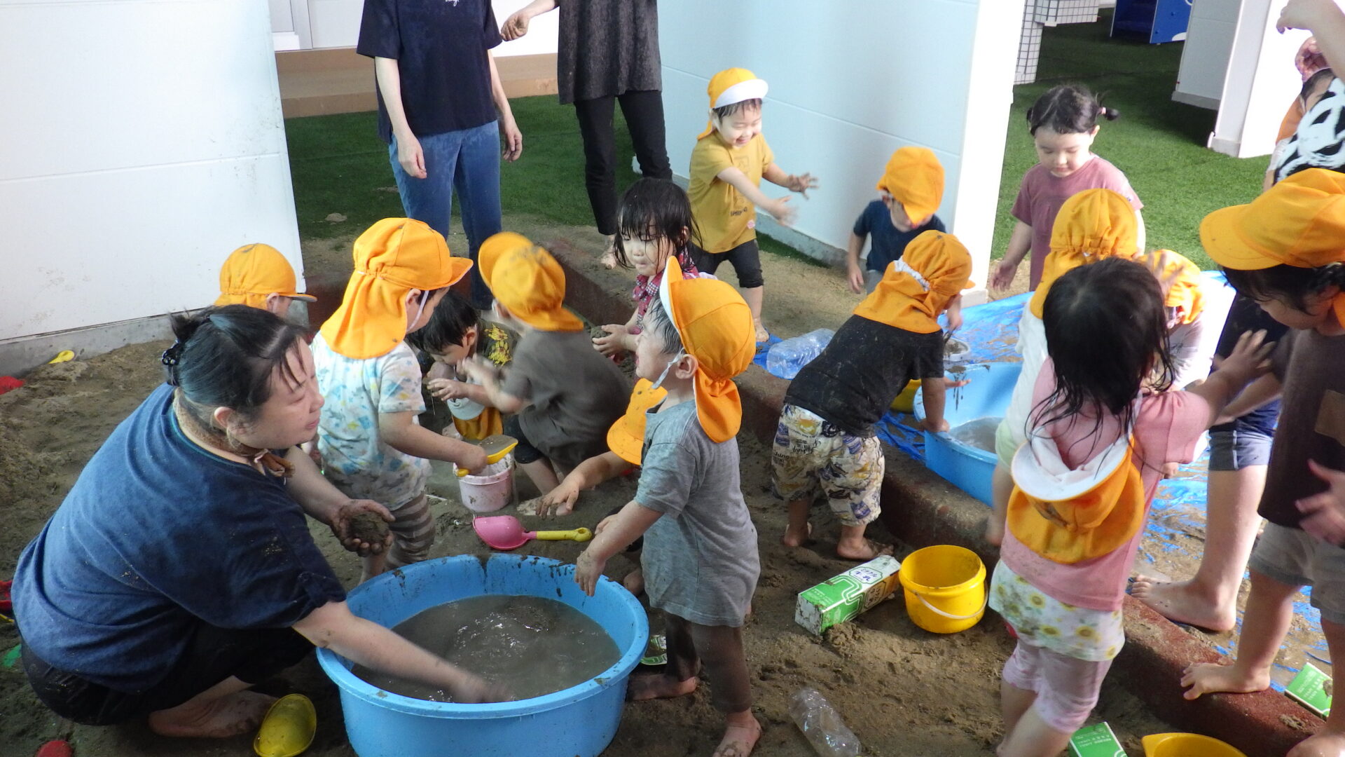 みんなの協力もあり、あっという間に砂場やタライが泥んこ状態になりました(o^―^o)