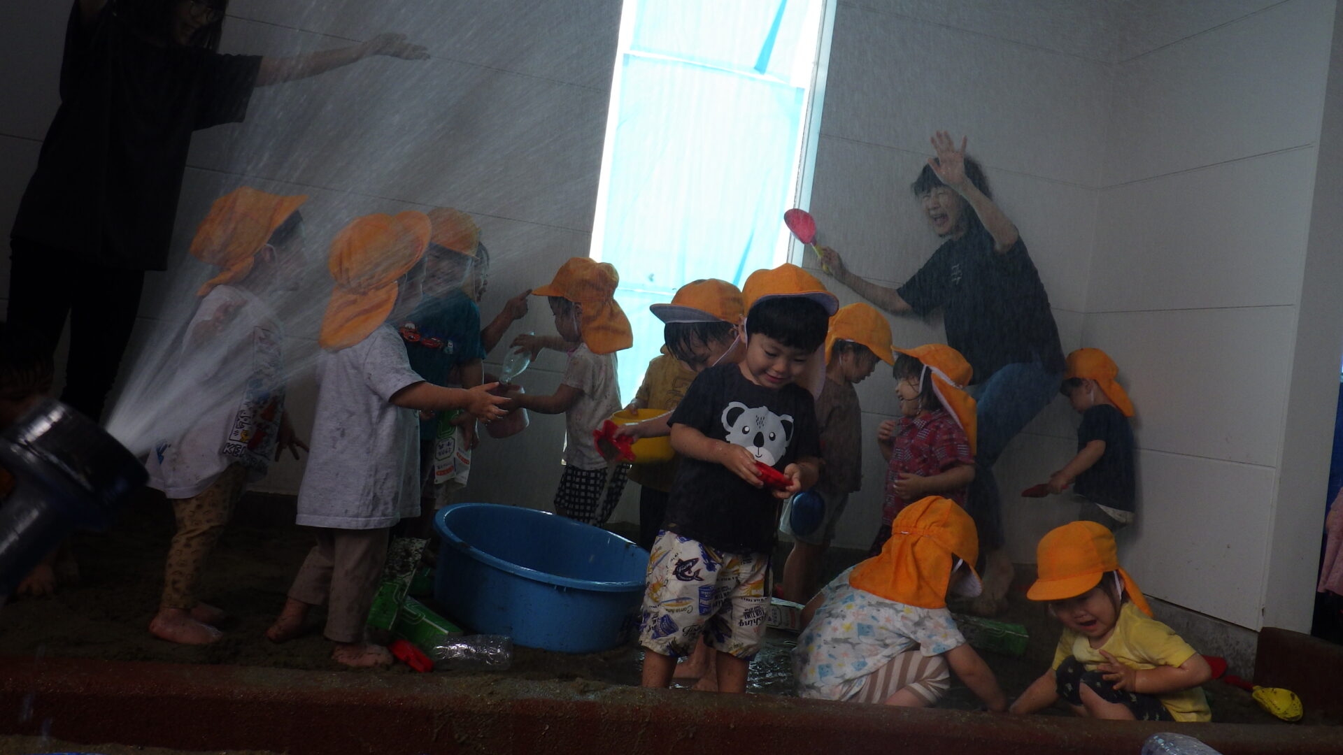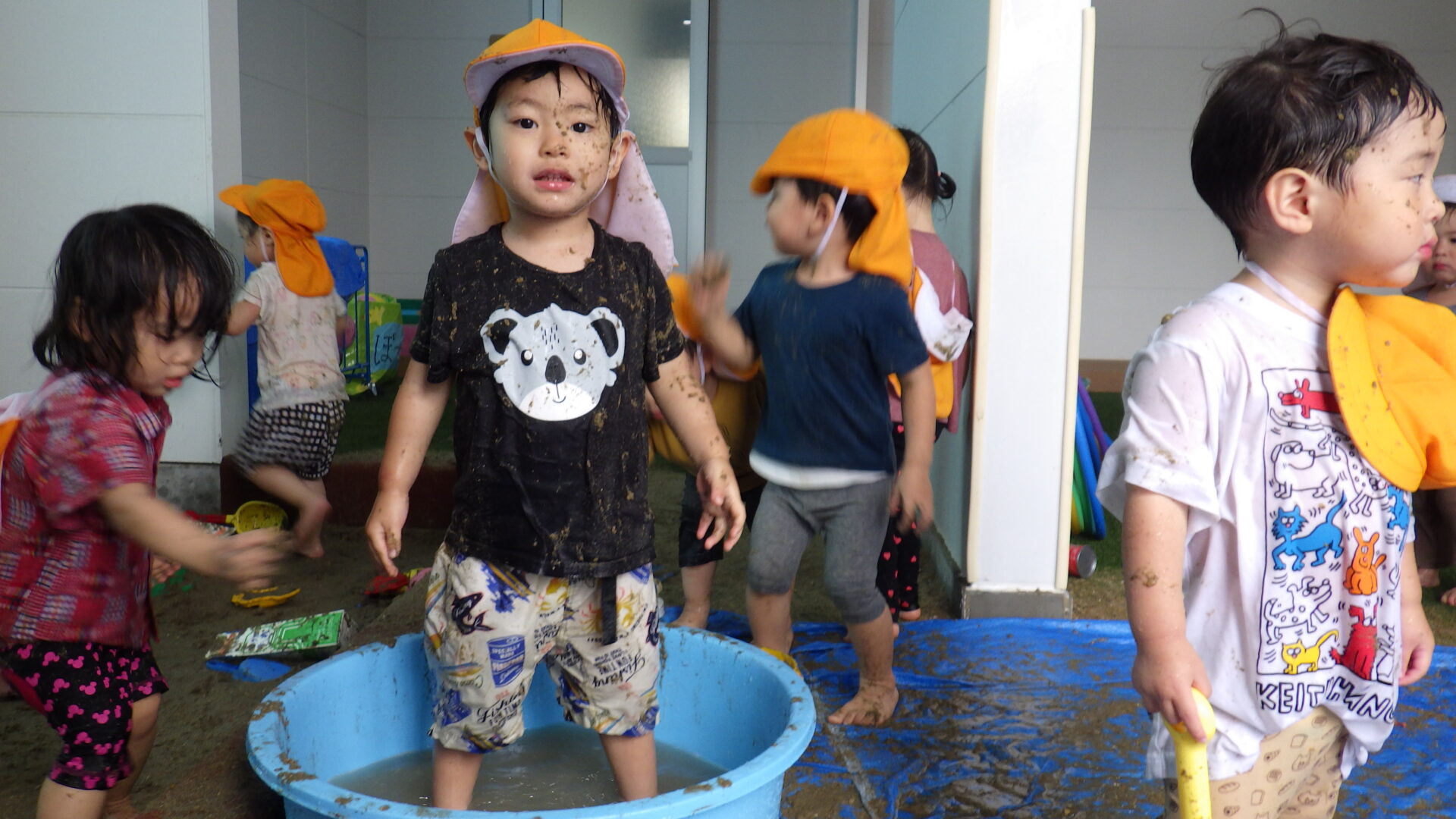 子どもたちは、大胆にタライの中へ~♪