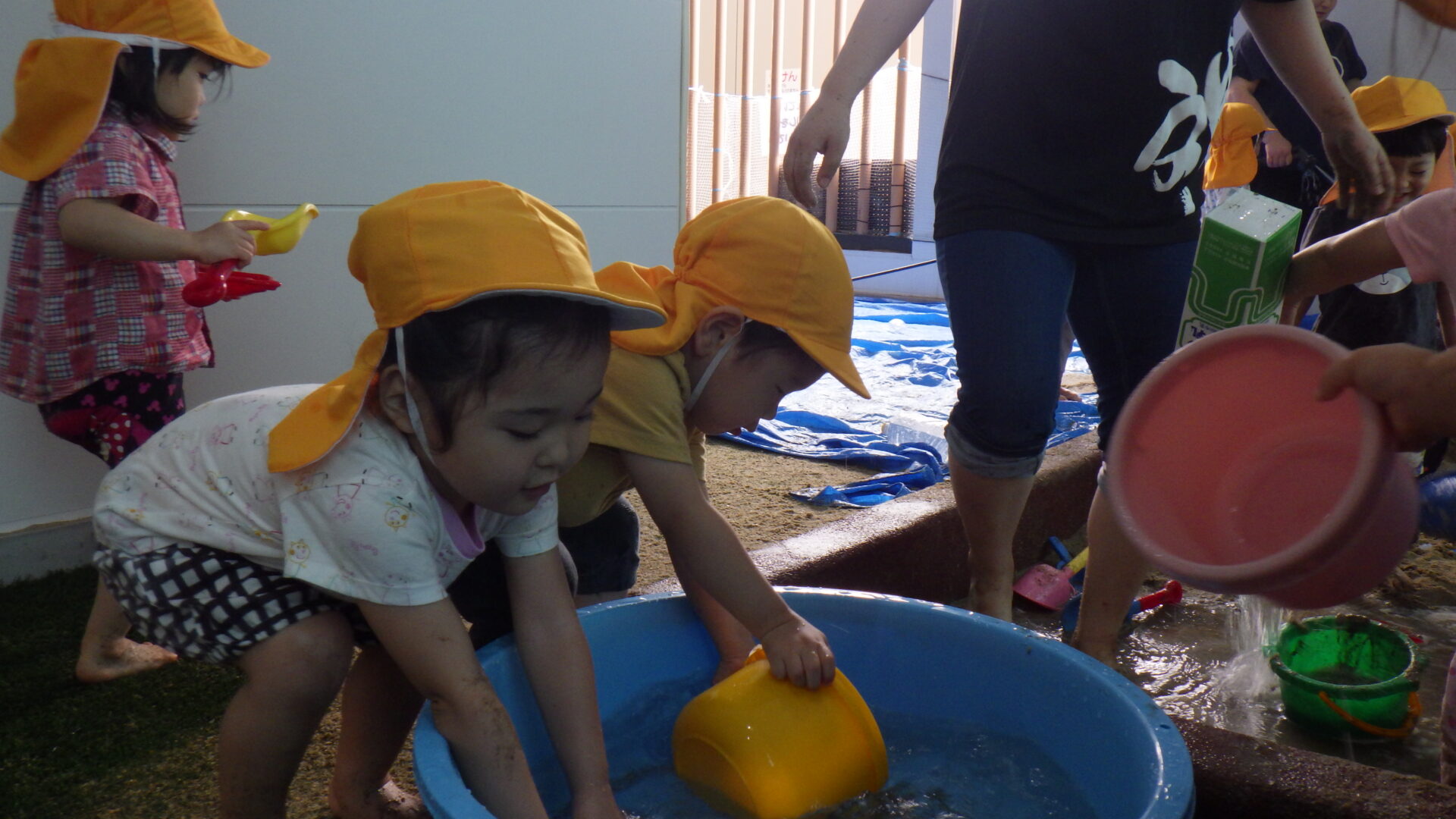 大きなタライに入っている水を砂場に運んだり、