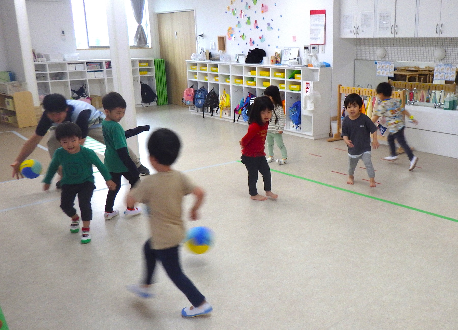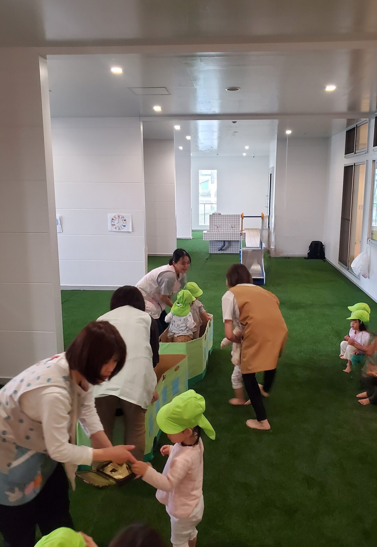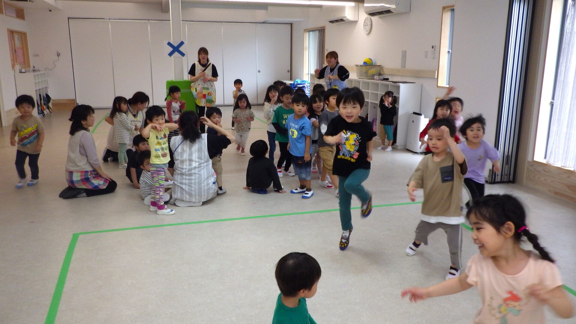 雨が降って遠足には行けなかったけど、太宰府くじら保育園には、室内園庭があります。