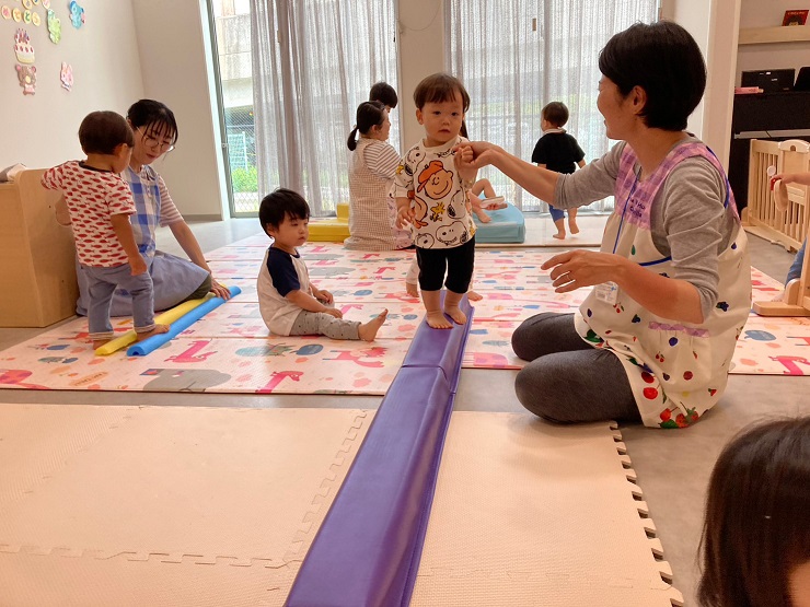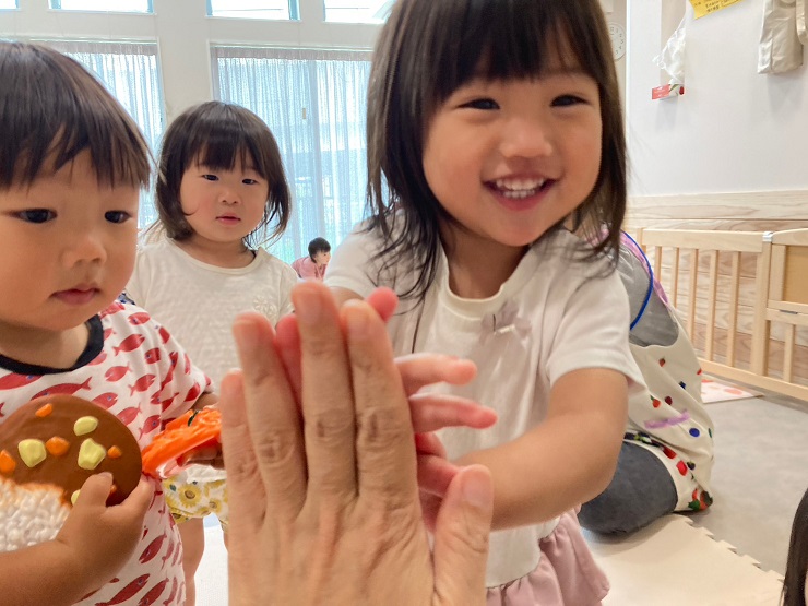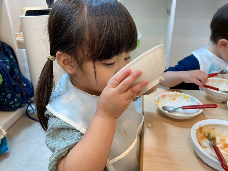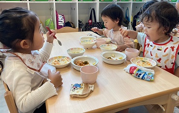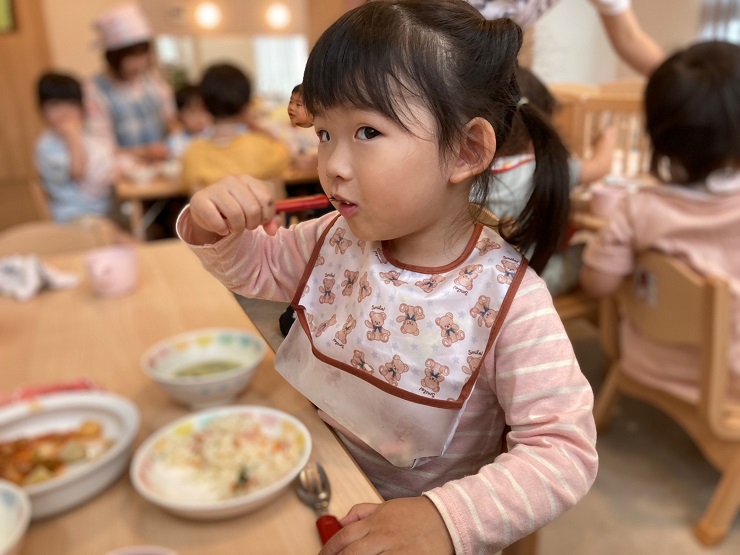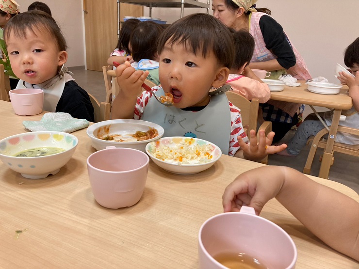 (一つ上の2歳児、あめ組さんの給食の様子)