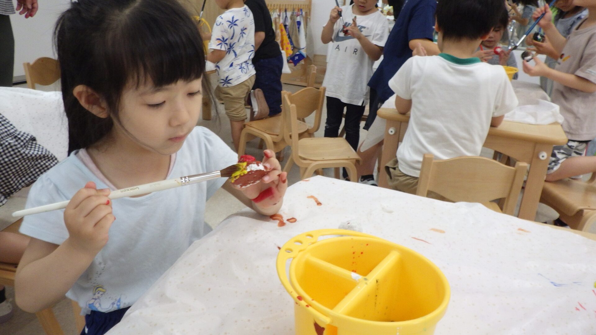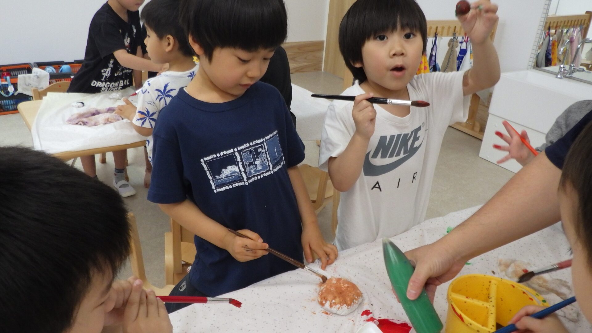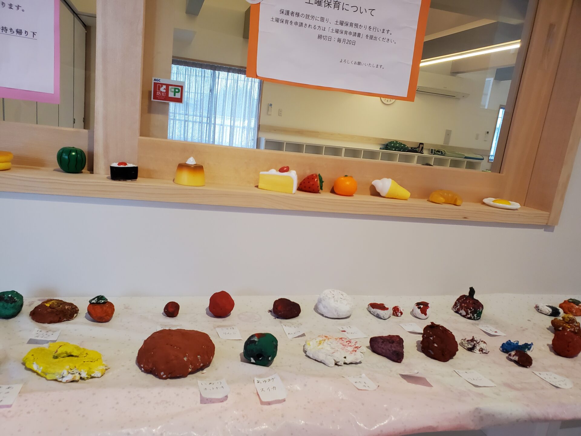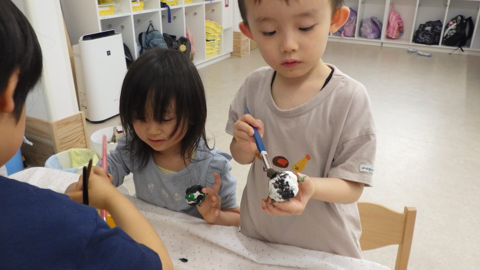 食べ物をイメージして形を作り、乾燥させて後日、絵の具で色をつけました。