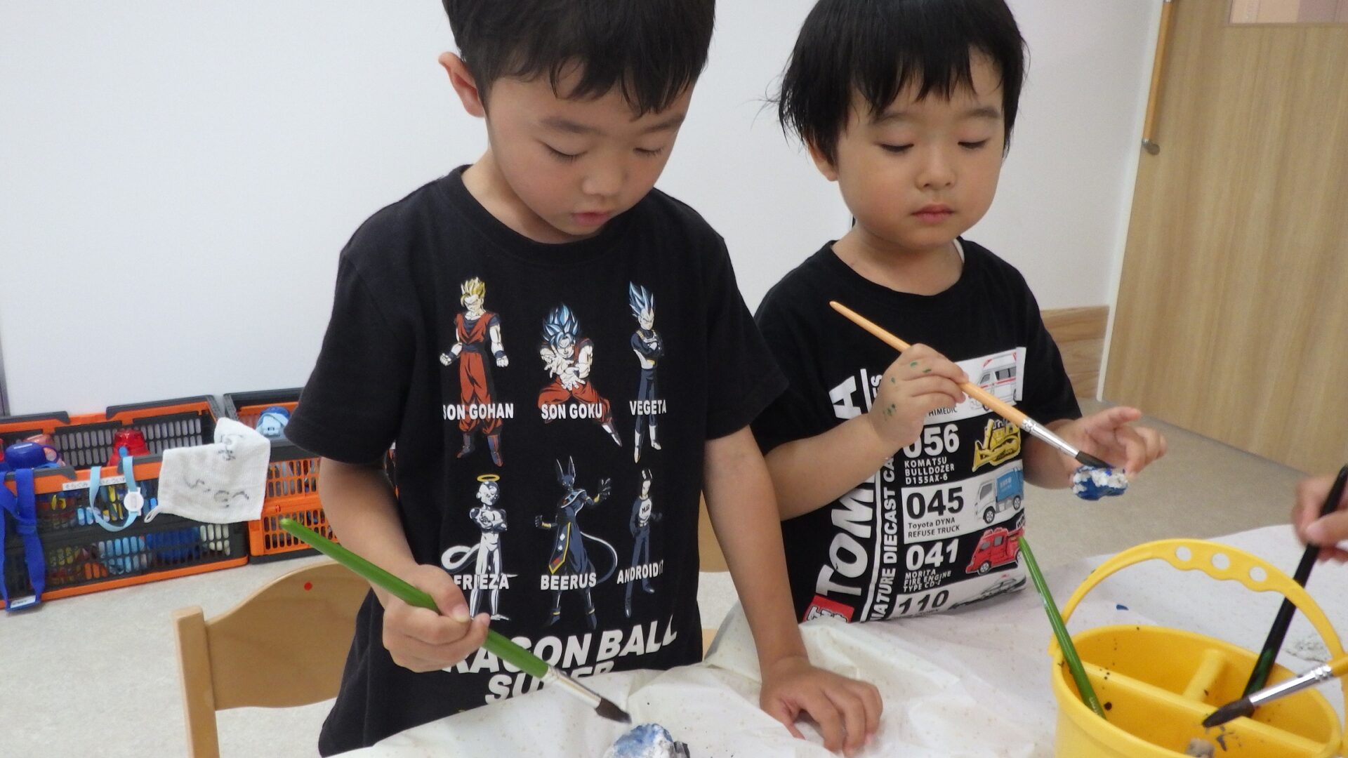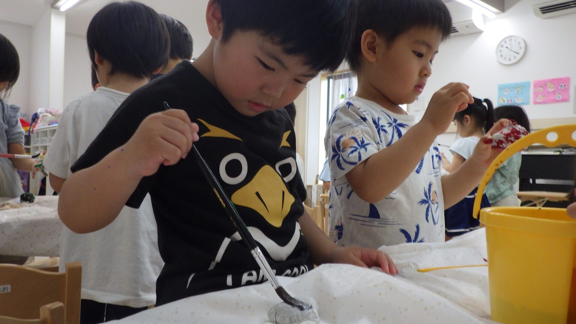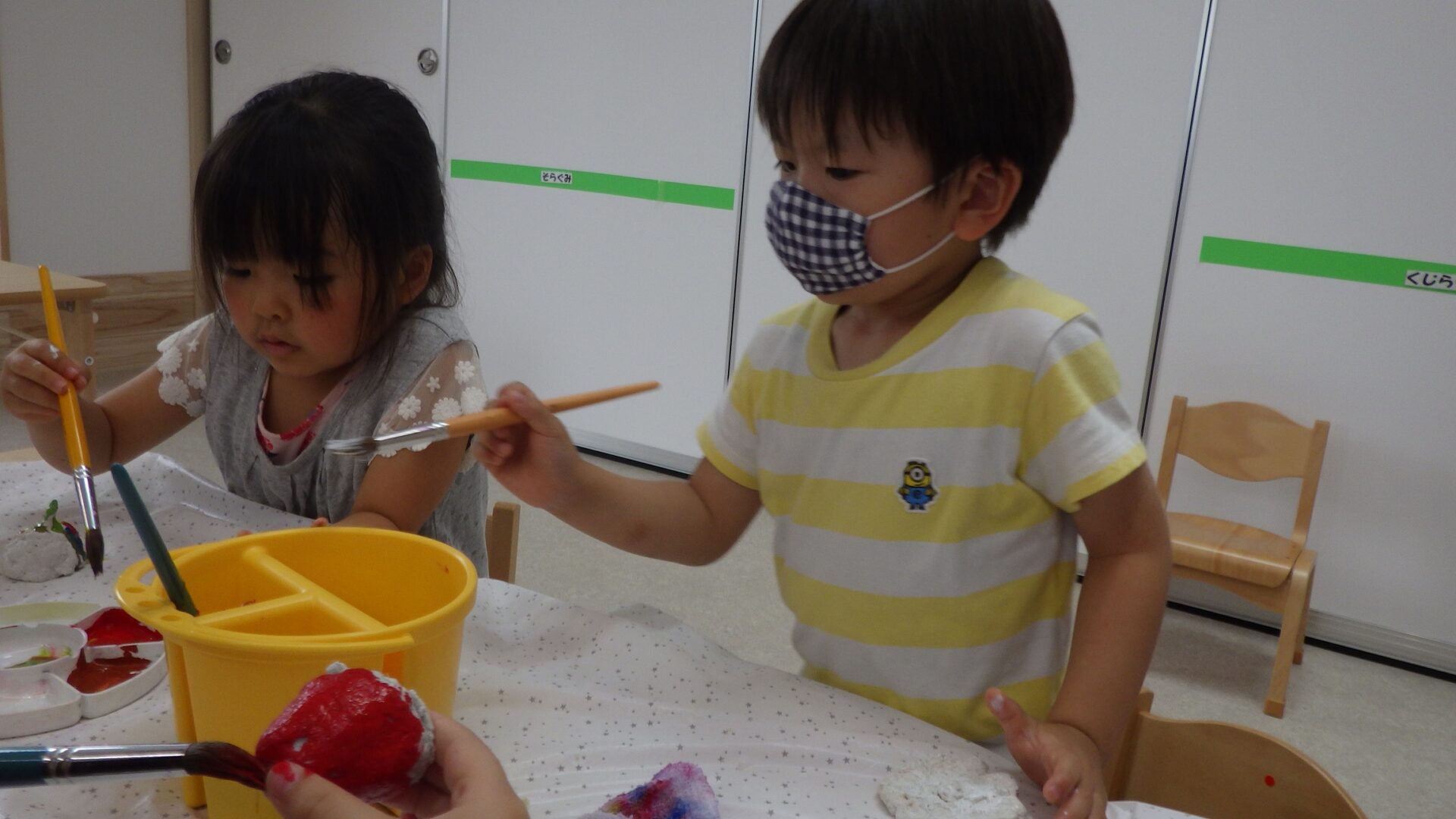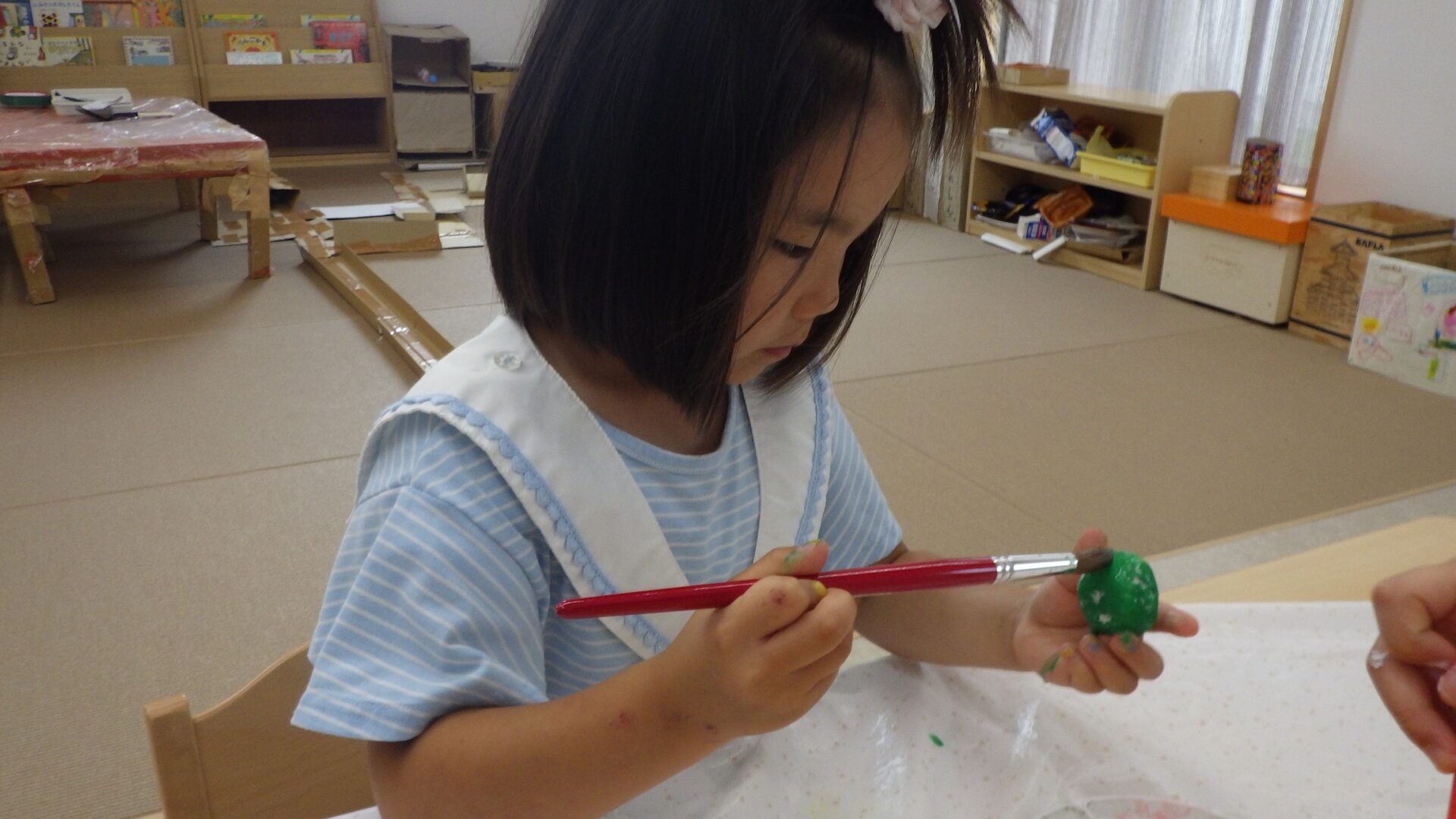 食べ物をイメージして形を作り、乾燥させて後日、絵の具で色をつけました。
