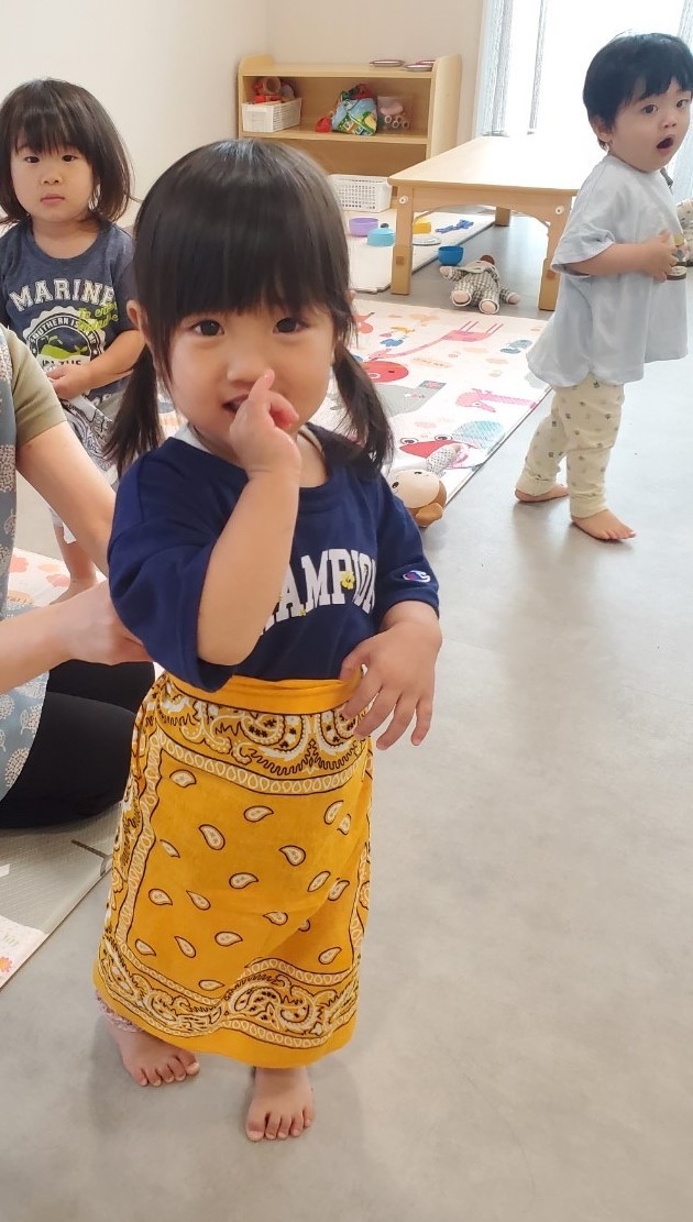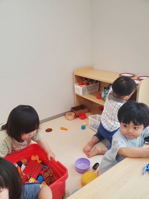 1歳だいち組は、保育園に慣れ、少しずつ1人で、遊べるようになりましたが、保育士のそばに寄り添い、遊ぶことが多いので、広いだいち組の部屋では、少しおちつかないようでした。そこで、だいち組より少し狭いあめ組へのお引越しを考えました。