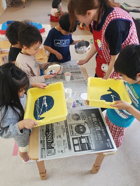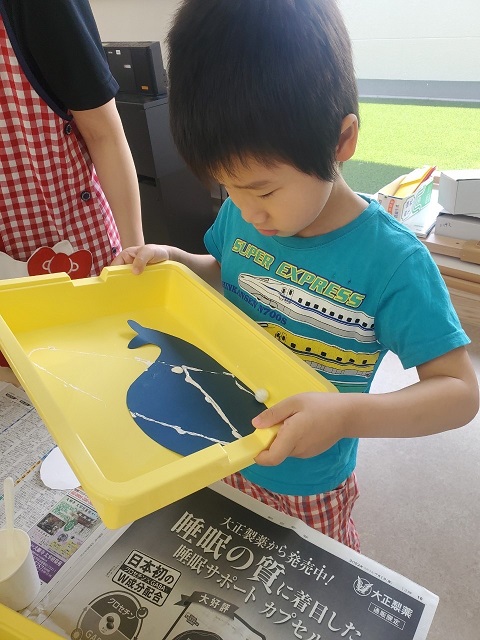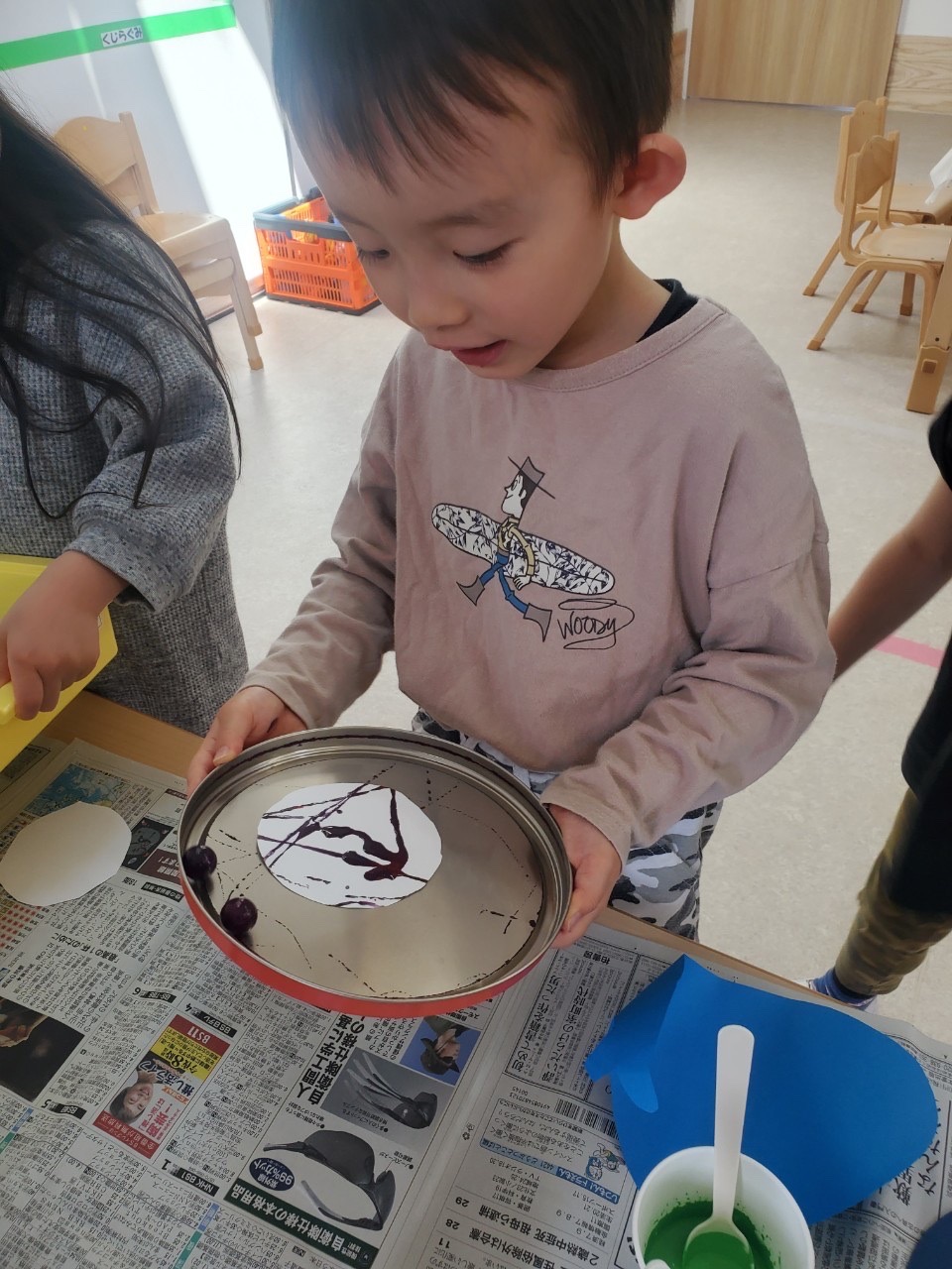 真剣に、集中して転がしていました。色画用紙にできた模様はみんな違ったね。