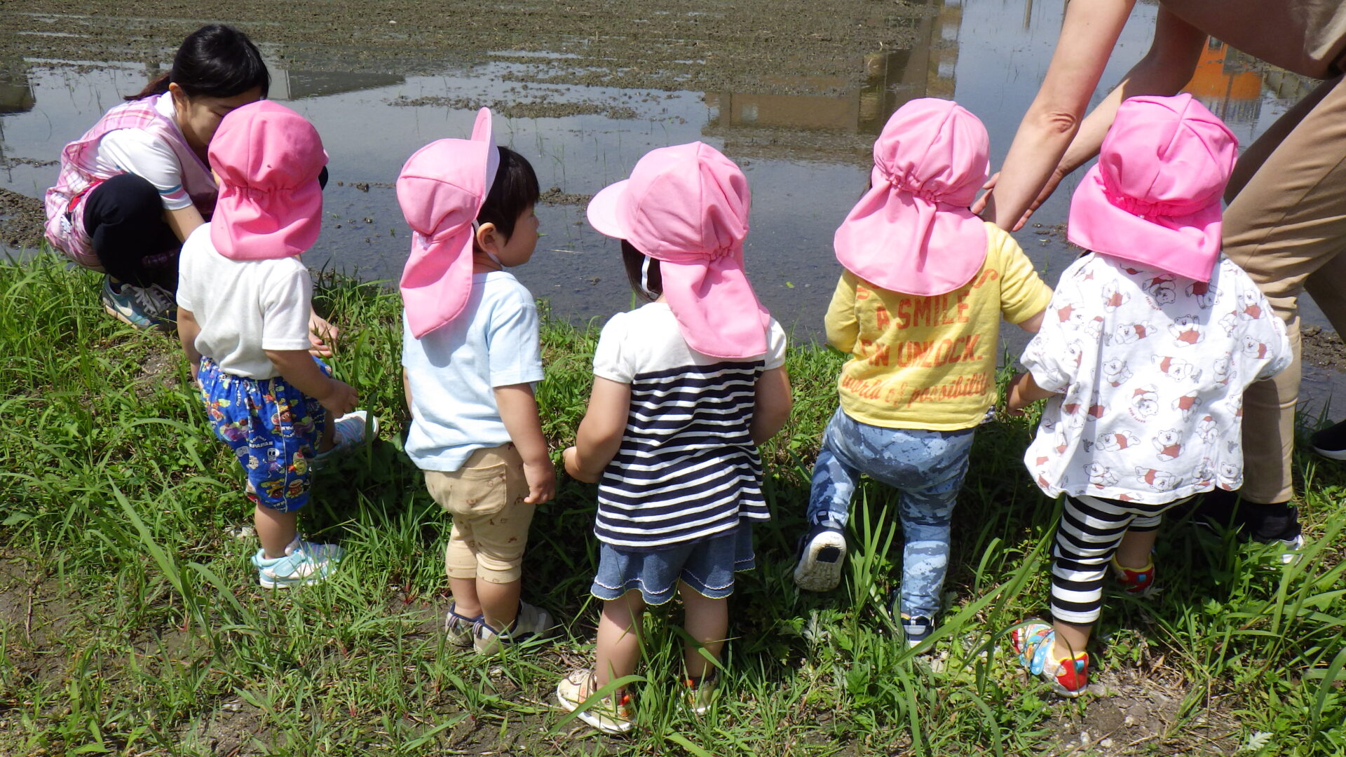 田んぼには、カエルやスズメがいて子どもたちも指差ししたり、