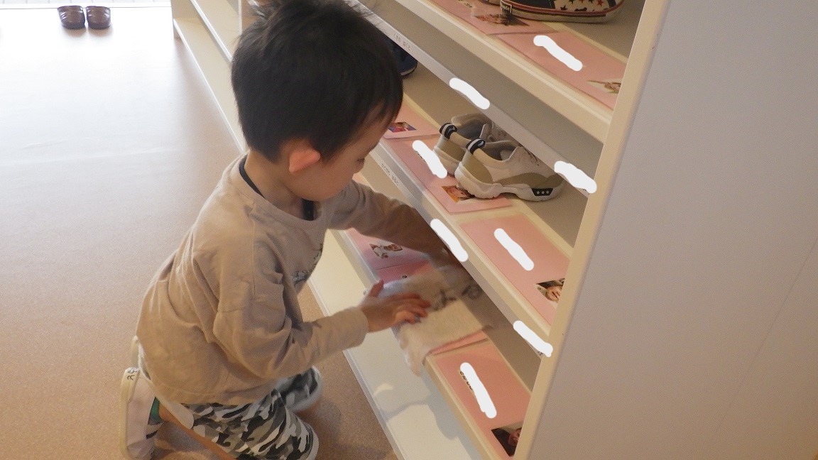 年長児くじら組のお兄さんお姉さんたちが、みんなの靴箱をお掃除してくれていたのです。